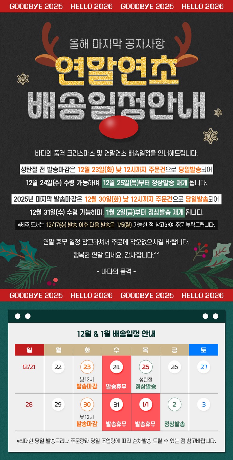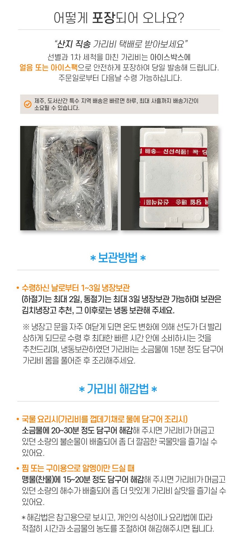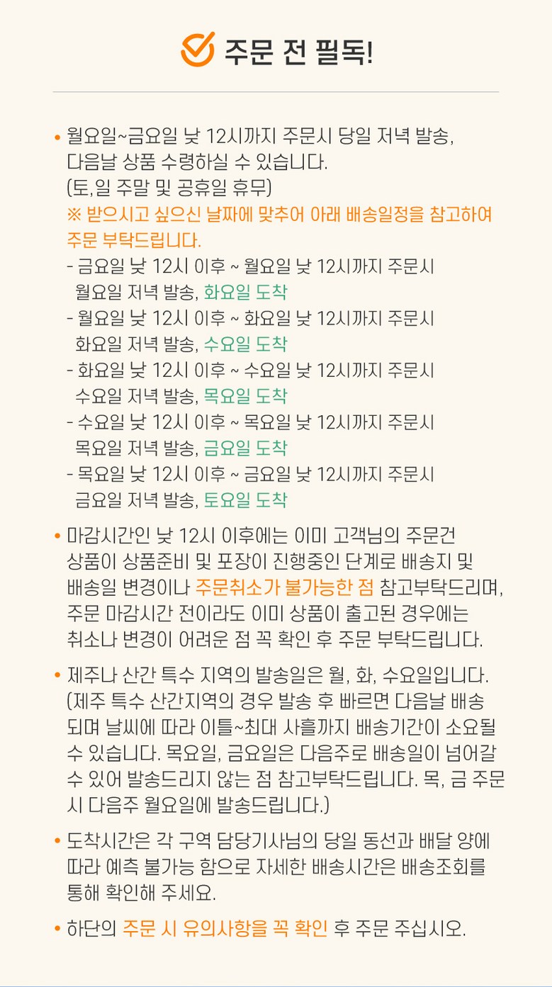| 배송방법 | 신선/냉장/냉동 | 배송비 | 무료배송 · 도서산간 추가 배송비 - 제주 지역: 5,000원 - 도서산간 지역: 5,000원 |