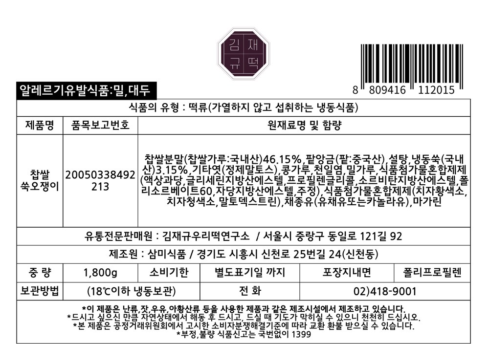 | 제품명 | 찹쌀 쑥오쟁이 | 식품의 유형 | 컨텐츠참조 |