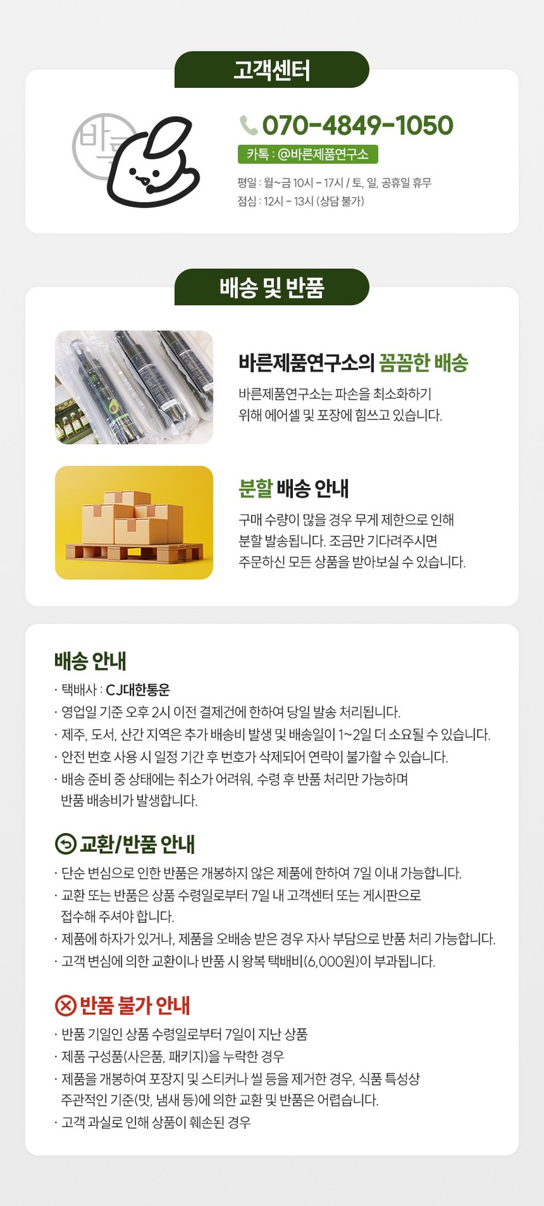 | 배송방법 | 순차배송 | 배송비 | 무료배송 · 도서산간 추가 배송비 - 제주 지역: 3,000원 - 도서산간 지역: 5,000원 |