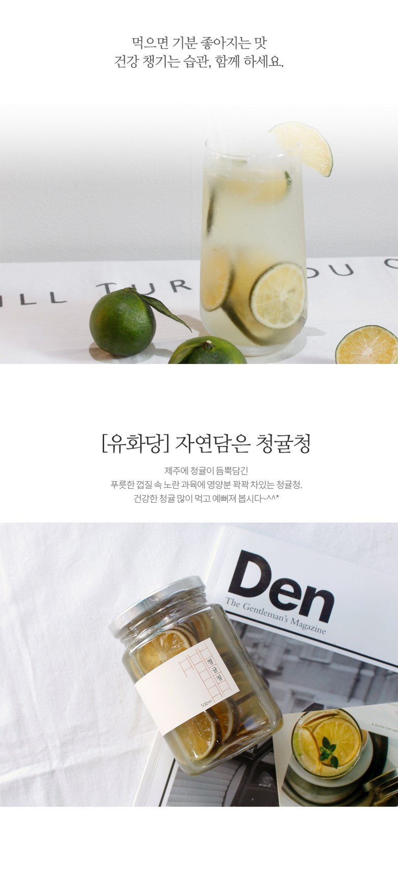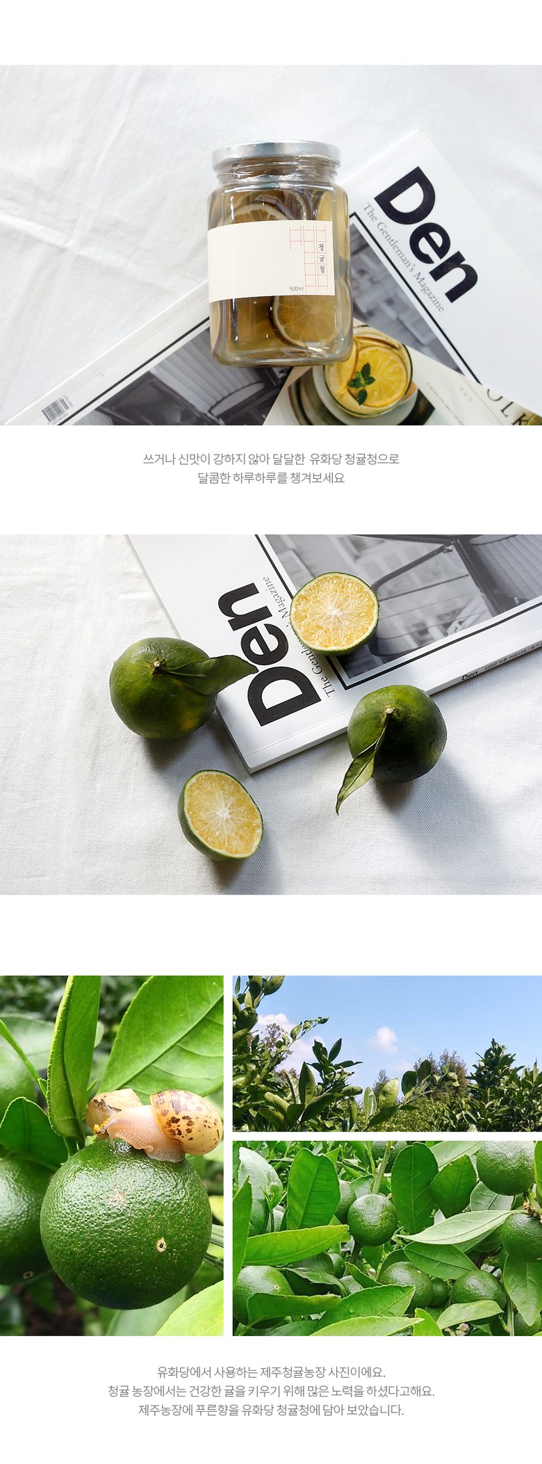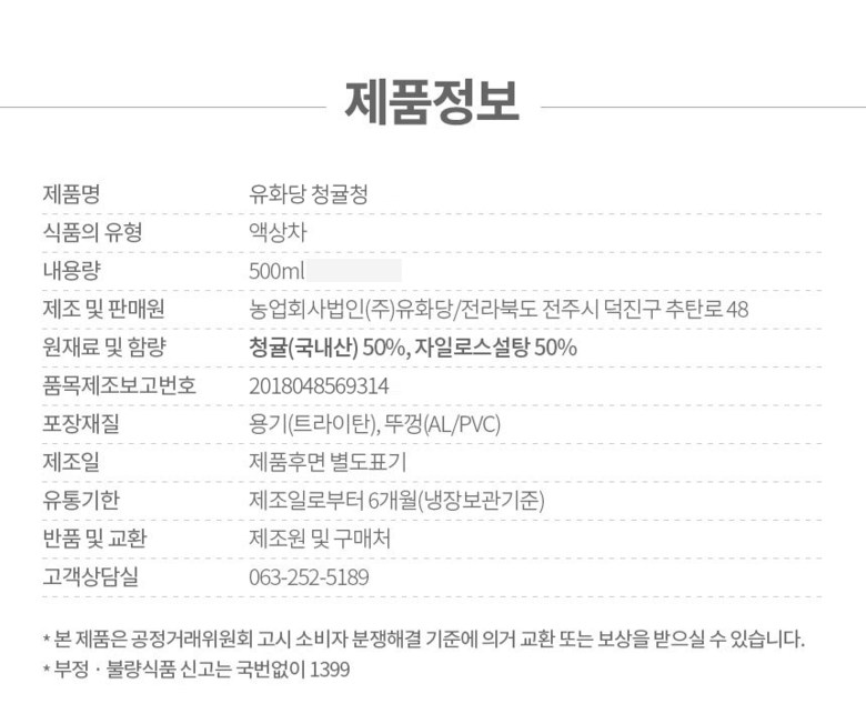 | 포장단위별 내용물의 용량(중량), 수량 | 유화당 청귤청 500ml / 1병 | 원재료명 및 함량 | 청귤(국내산)50%, 자일로스설탕50% |