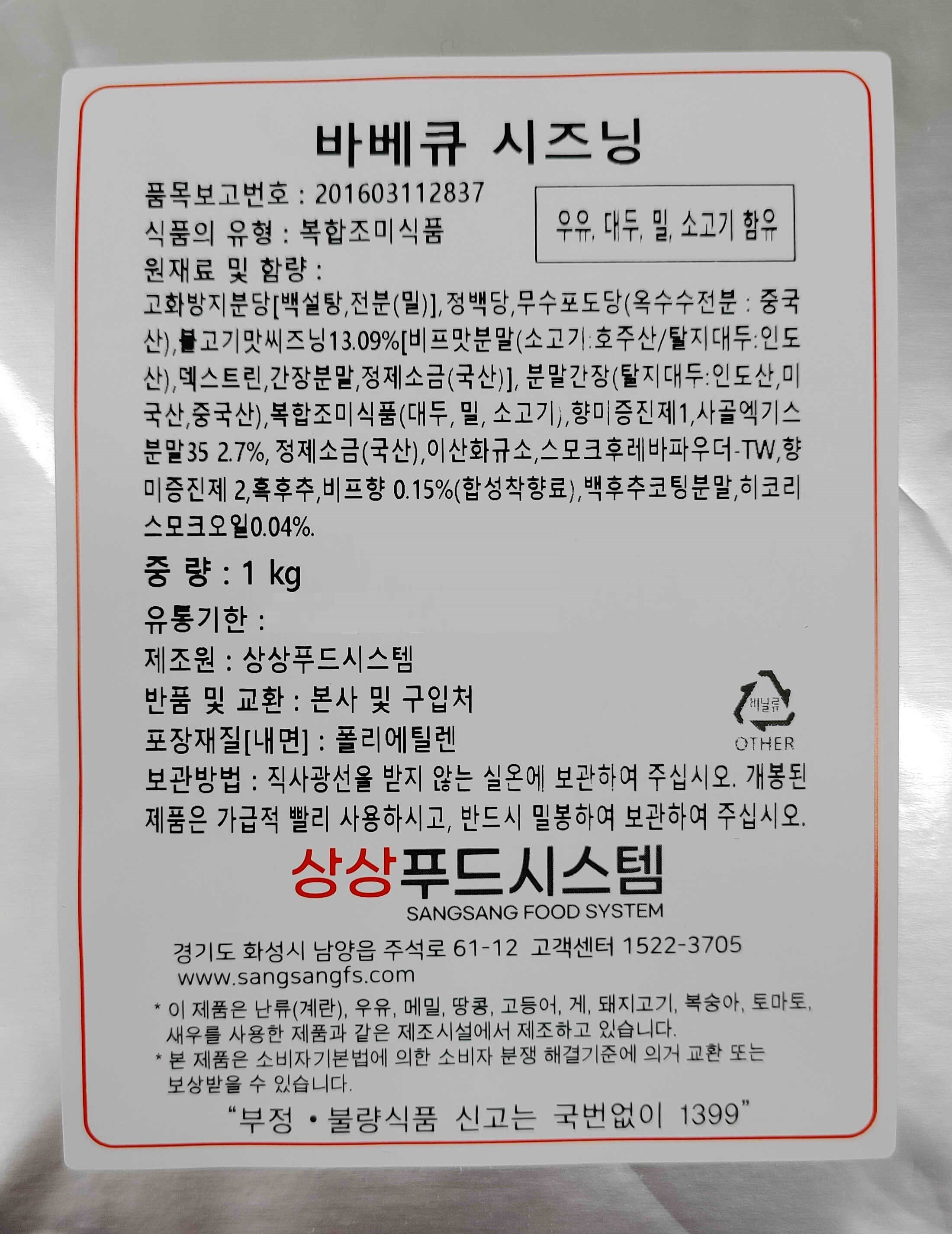 | 제품명 | 바베큐 시즈닝 | 식품의 유형 | 복합조미식품 |