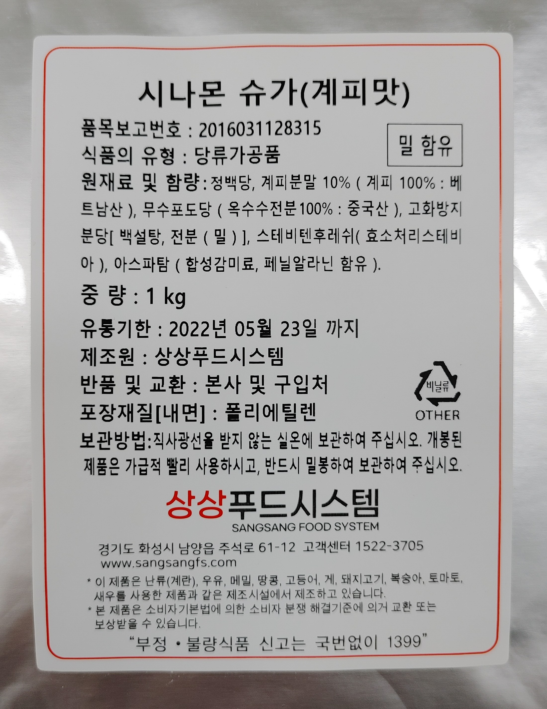 | 제품명 | 시나몬 슈가(계피맛) | 식품의 유형 | 당류가공품 |