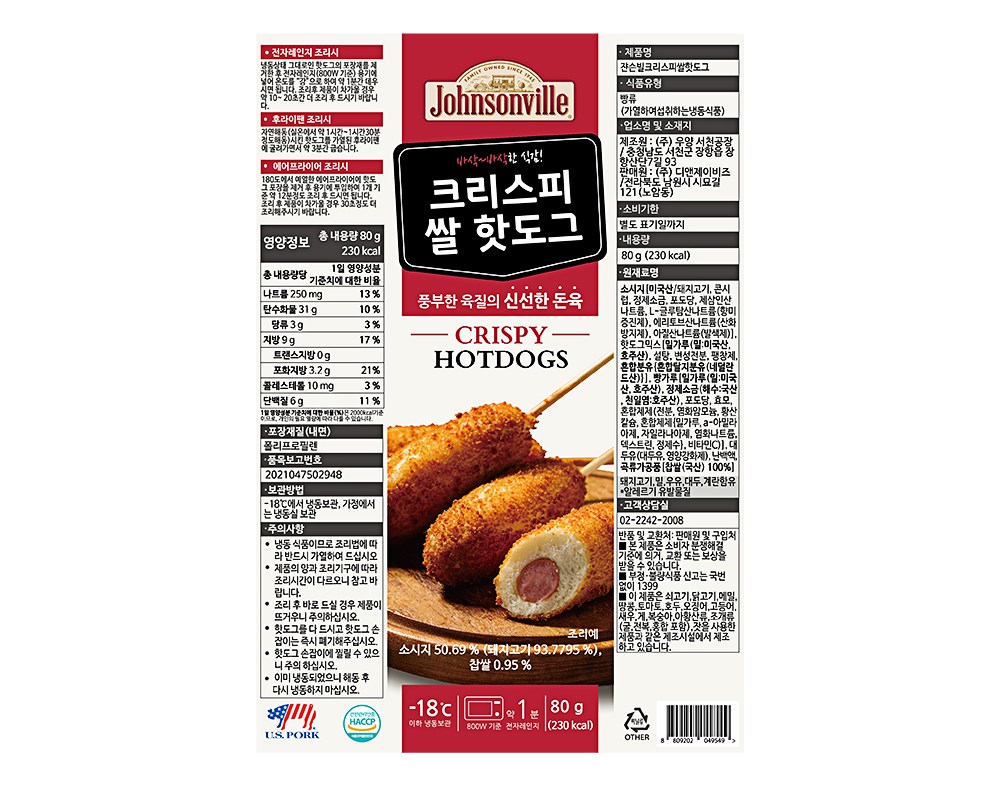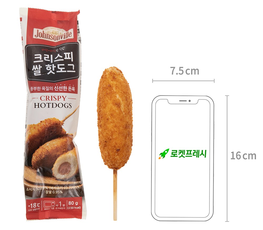 쟌슨빌 크리스피 쌀 핫도그로 한 입 가득 풍성한 식감과 맛이 감도는 간식을 만나보세요. 겉은 바삭하고 속은 부드럽고 폭신한 빵 속에 맛있는 소시지가 숨어있답니다. 육질의 풍부한 식감과 진한 육즙이 살아있는 쟌슨빌의 특별한 소시지가 인상적인 풍미를 선사하죠. 전자레인지로 간편하게 조리해 맛있게 즐겨보세요.