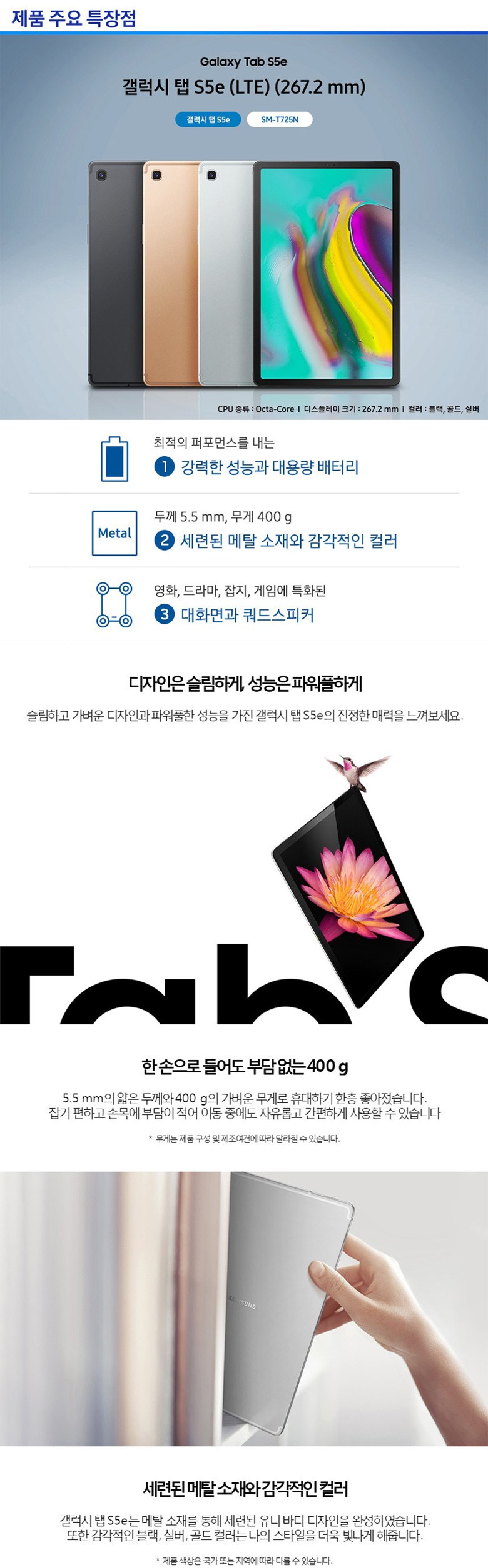 | 품명 및 모델명 | 삼성 갤럭시탭S5E LTE-WIFI겸용 SM-T725 RAM4G-64GB 블랙 | KC 인증정보 | YU10256-19001, R-C-SEC-SMT725N |