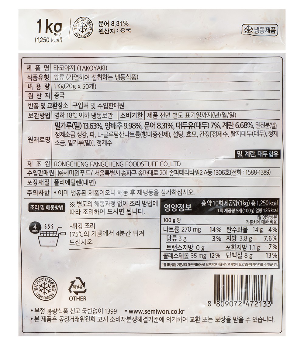 | 제품명 | 타코야끼 | 식품의 유형 | 빵류(가열하여 섭취하는 냉동식품) |