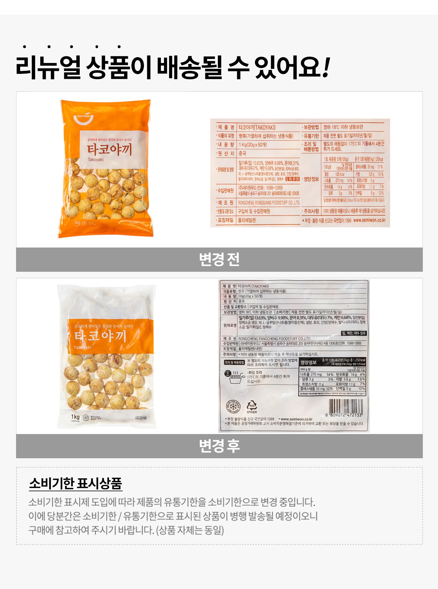 | 생산자 및 소재지 | RONGCHENG FANGCHENG FOODSTUFF CO.,LTD. / (주)세미원푸드 / 중국 | 소비기한 또는 품질유지기한 | 소비기한(또는 유통기한) : 2027년 04월 08일 이거나 그 이후인 상품 |