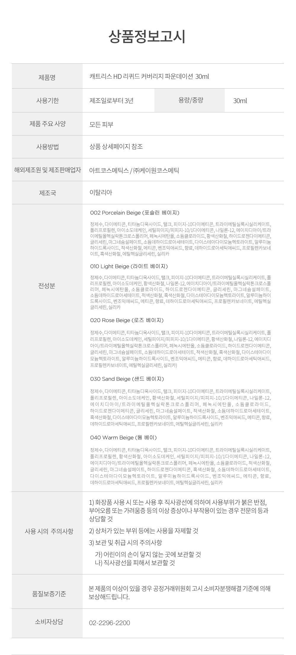 | 화장품제조업자, 화장품책임판매업자 및 맞춤형화장품판매업자 | 아트코스메틱스 / ㈜케이원코스메틱 | 제조국 | 이탈리아 |