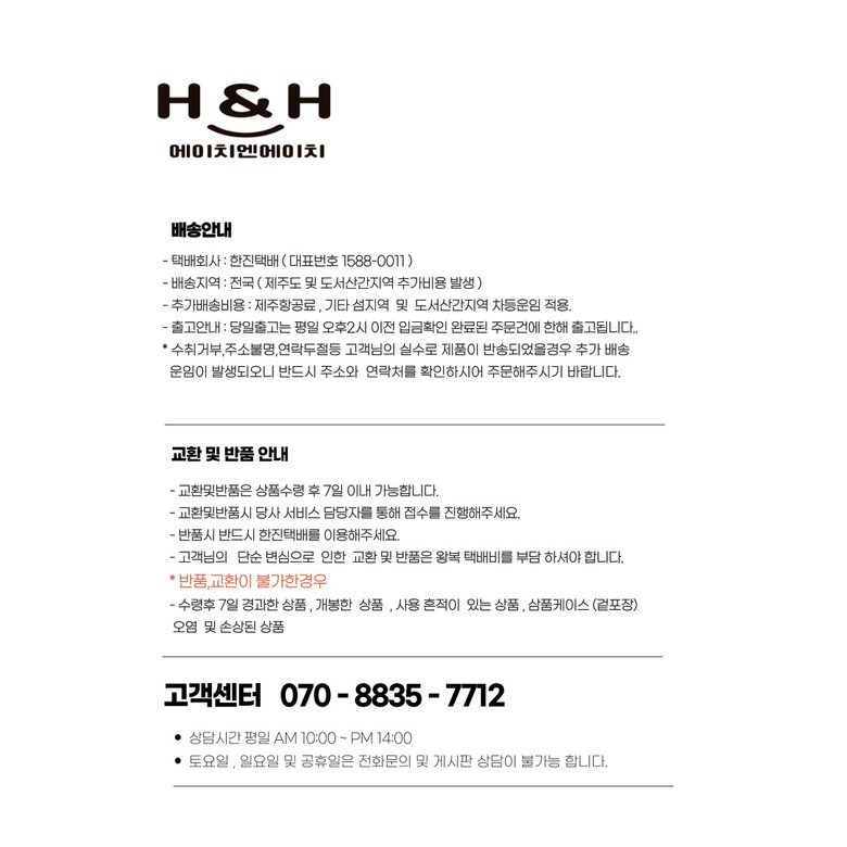 - ㆍ모니터 해상도의 차이로 인해 색상이나 이미지가 실제와 달라, 고객이 단순 변심으로 교환/반품을 무료로 요청하는 경우