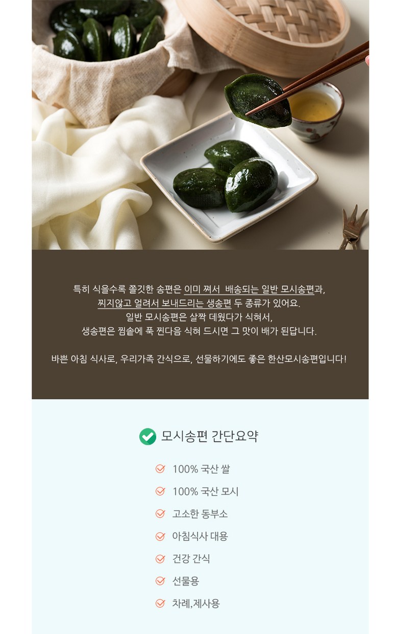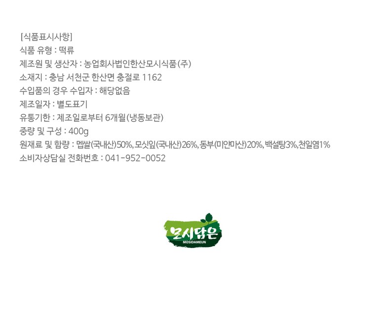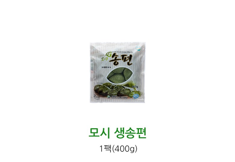 | 제품명 | 한산모시떡 모시생송편400g 10팩[ 4kg 100개] | 식품의 유형 | 떡류 |