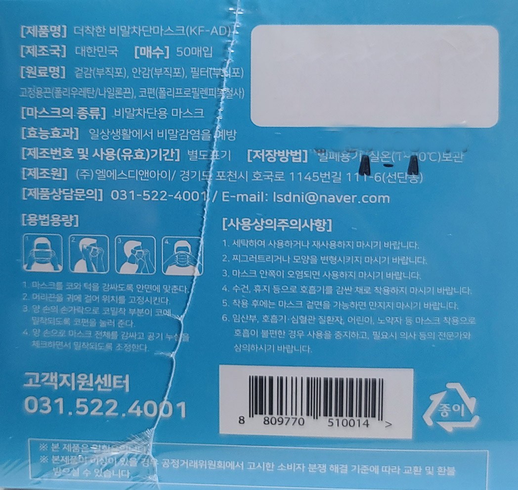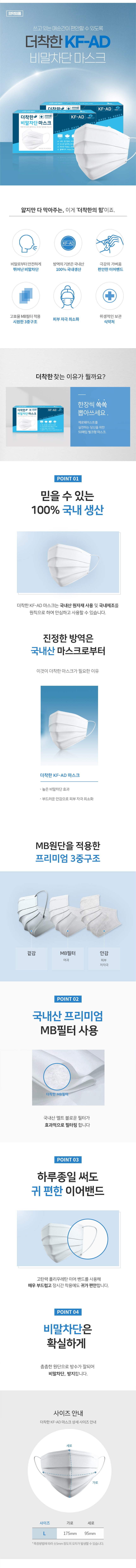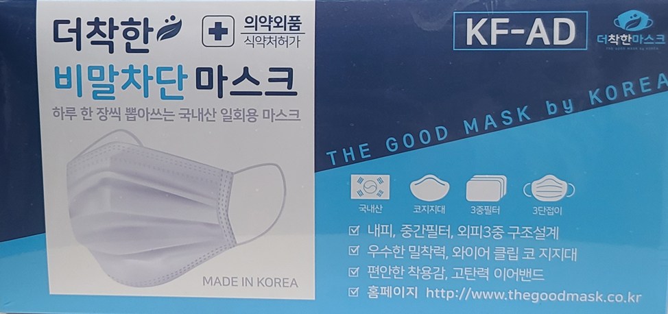 | 품명 및 모델명 | 더착한 비말차단마스크(KF-AD) | 인증/허가 사항 | 의약외품 |