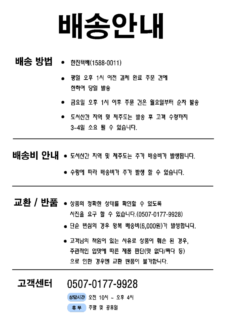 | 배송방법 | 순차배송 | 배송비 | 무료배송 - 도서산간 지역 배송불가 |