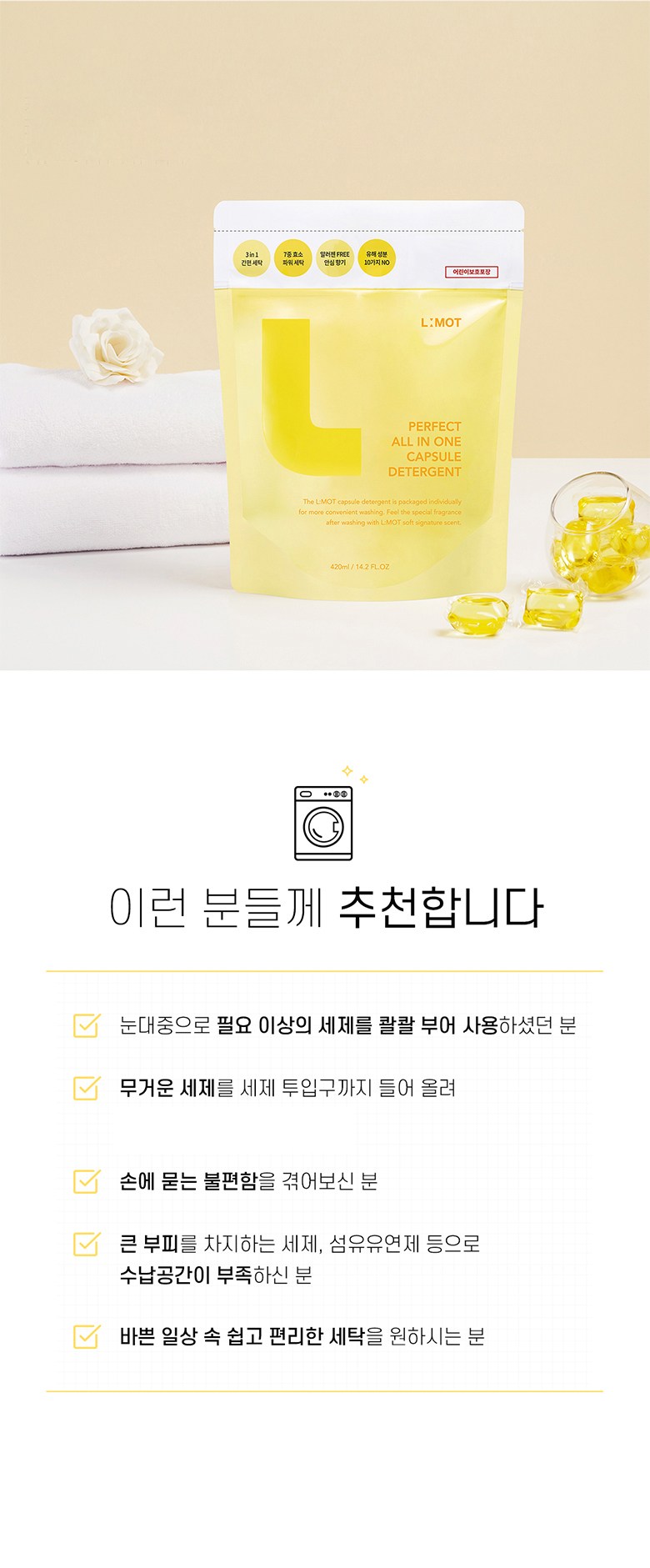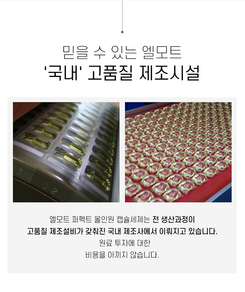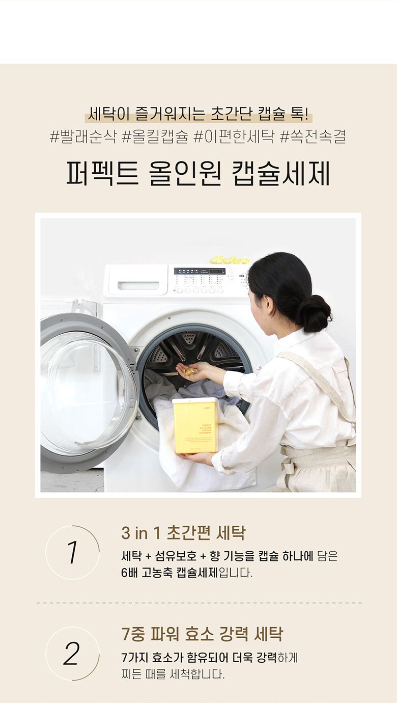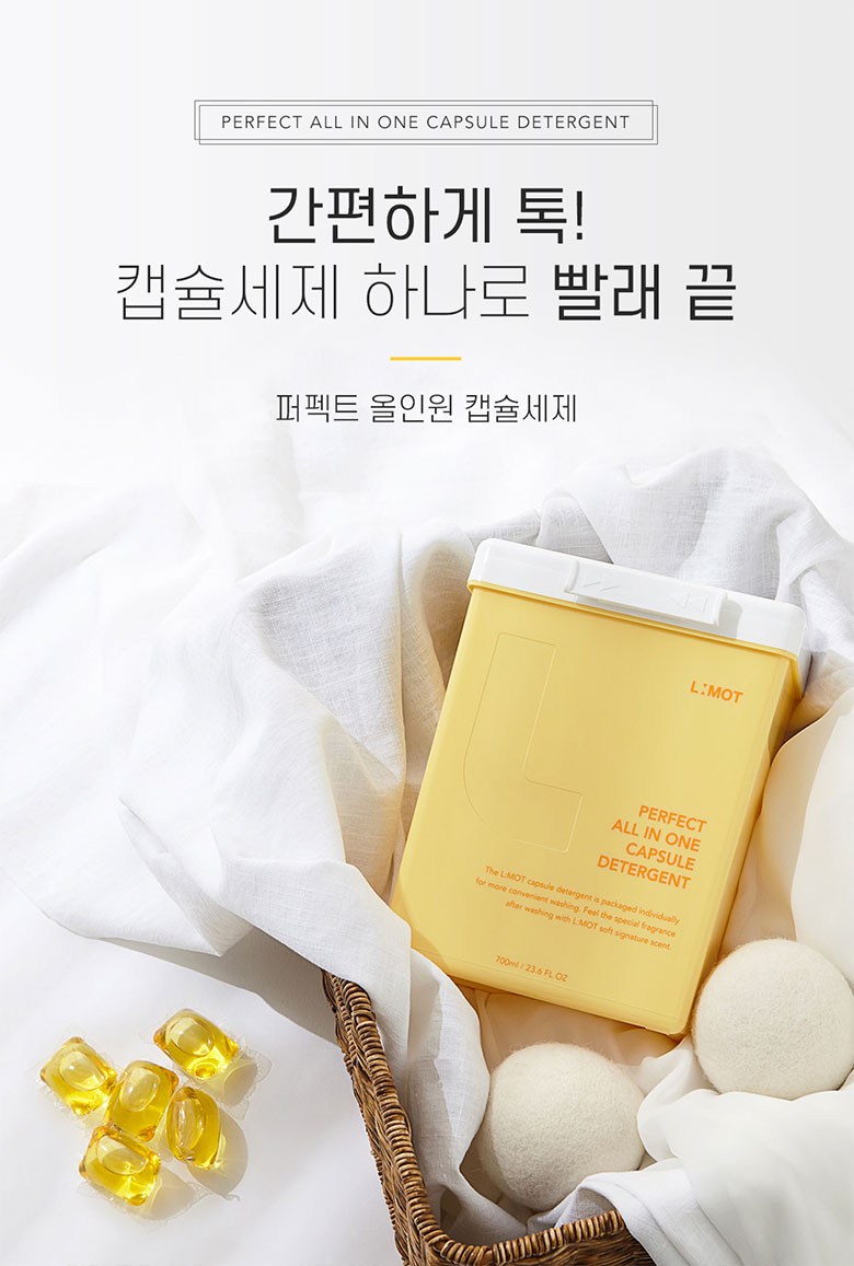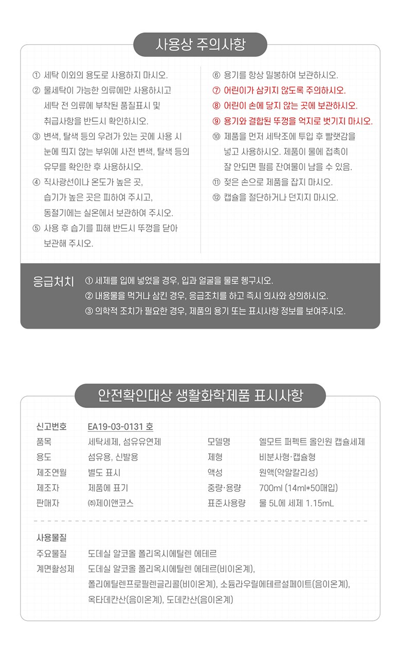| 품목 및 제품명 | 세탁세제/엘모트 퍼펙트 올인원 캡슐세제 | 용도(표백제의 경우 계열을 함께표시) 및 제형 | 신발용,섬유용/비분사형-캡슐형 |