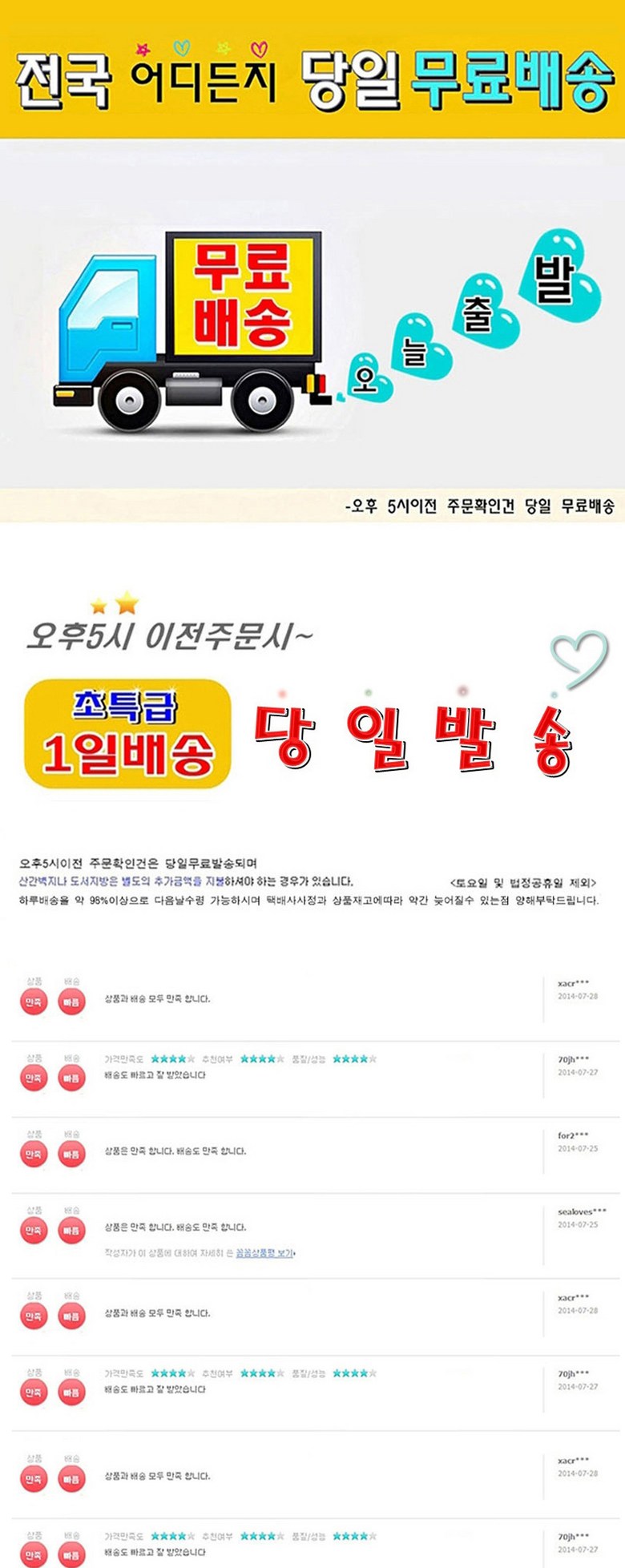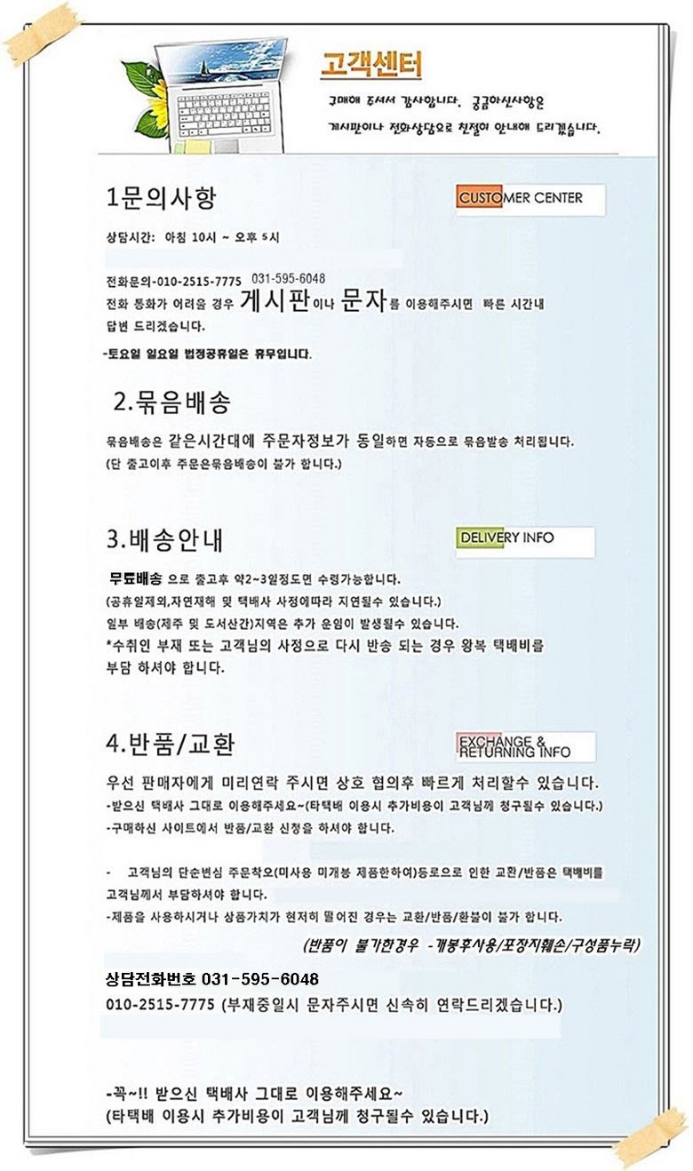 - ㆍ모니터 해상도의 차이로 인해 색상이나 이미지가 실제와 달라, 고객이 단순 변심으로 교환/반품을 무료로 요청하는 경우