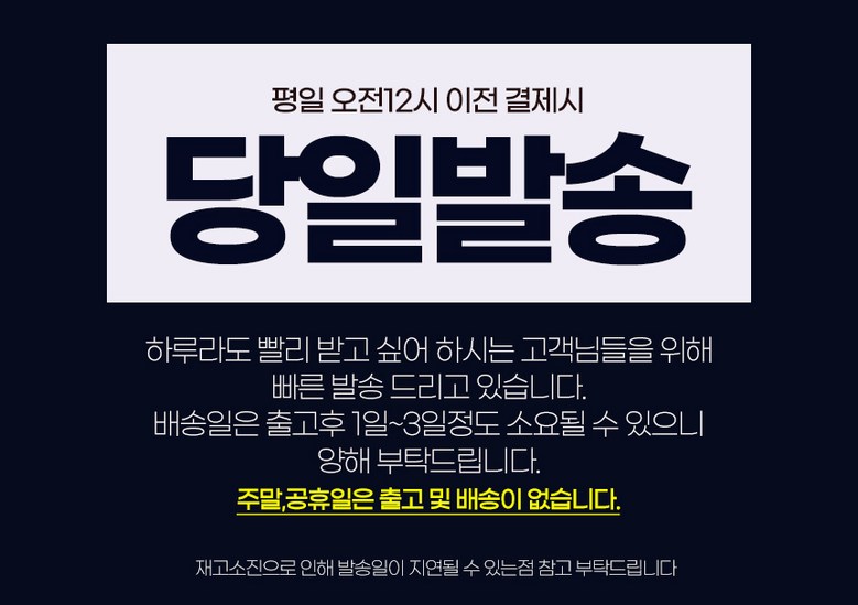 | 배송기간 | ㆍ도서산간 지역 등은 배송에 3-5일이 더 소요될 수 있습니다. - 천재지변, 물량 수급 변동 등 예외적인 사유 발생 시, 다소 지연될 수 있는 점 양해 부탁드립니다. | ||
