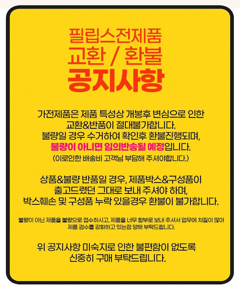 - ㆍ모니터 해상도의 차이로 인해 색상이나 이미지가 실제와 달라, 고객이 단순 변심으로 교환/반품을 무료로 요청하는 경우