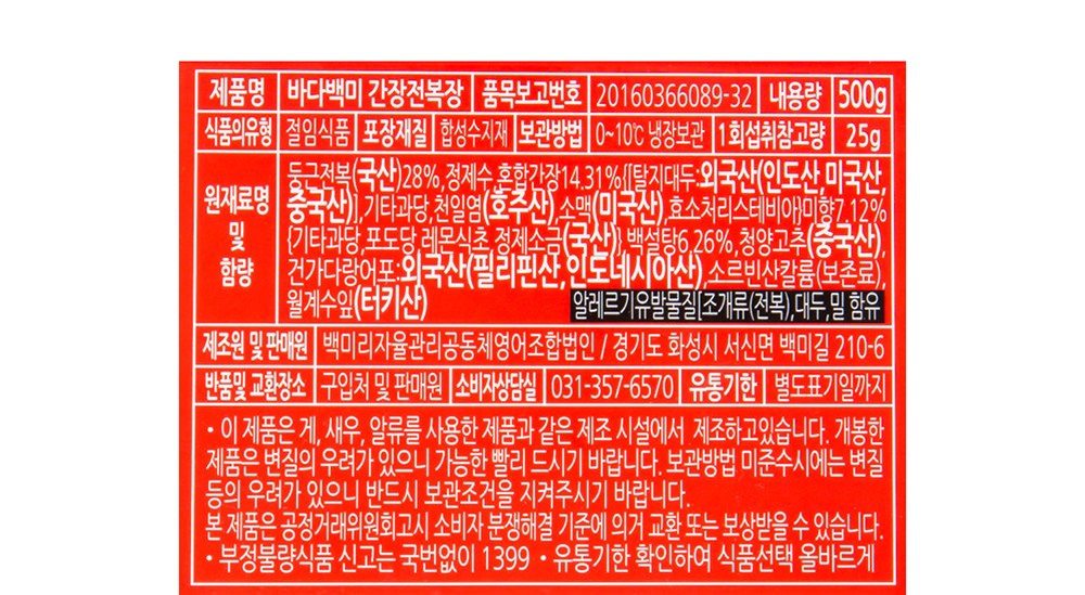 | 생산자 및 소재지 | 백미리자율관리공동체영어조합법인 / 경기 화성시 백미길 210+6 | 제조연월일, 소비기한 또는 품질유지기한 | 업데이트 예정 |