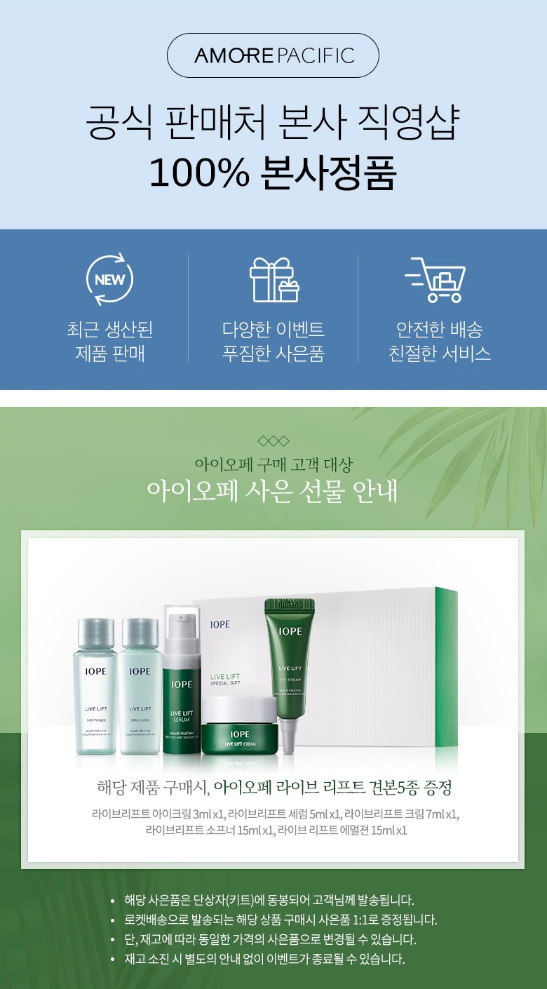 | 용량(중량) | 본품:35ml구성품:아이오페 라이브 리프트 아이크림 3ml아이오페 라이브 리프트 세럼 5ml아이오페 라이브 리프트 크림 7ml아이오페 라이브 리프트 소프너 15ml아이오페 라이브 리프트 에멀젼 15ml | 제품 주요 사양 | 본품:모든피부용구성품:아이오페 라이브 리프트 아이크림 3ml, 아이오페 라이브 리프트 세럼 5ml, 아이오페 라이브 리프트 크림 7ml모든피부아이오페 라이브 리프트 소프너 15ml, 아이오페 라이브 리프트 에멀젼 15ml모든피부, 건성 |