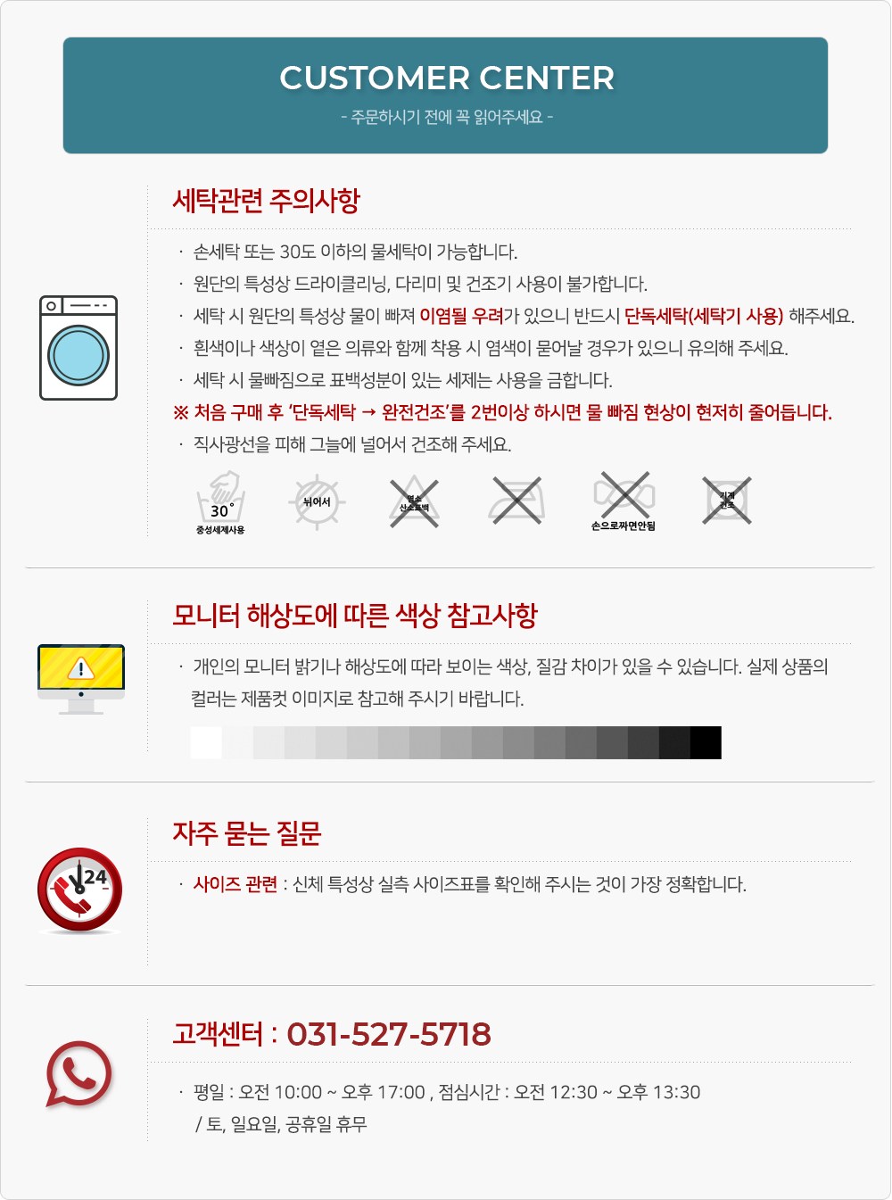 - ㆍ모니터 해상도의 차이로 인해 색상이나 이미지가 실제와 달라, 고객이 단순 변심으로 교환/반품을 무료로 요청하는 경우