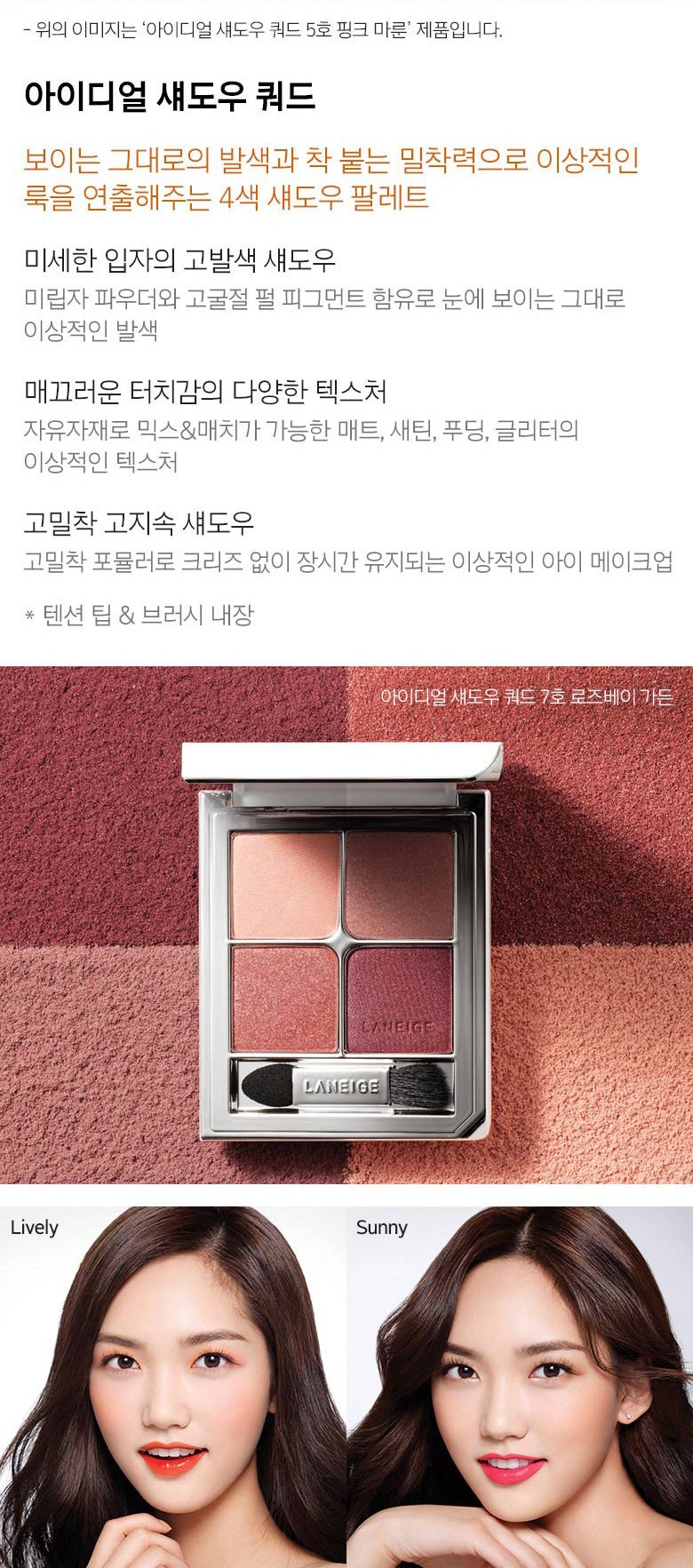 | 사용기한 또는 개봉 후 사용기간 | 본품:제조일로부터 3년. 공급사 사정에 따라 제조일자가 다른 상품이 입고되어 정확한 제조년월일 및 사용기한 확인이 어렵습니다. 제조년월일 확인이 어려운 상품은 유통기한을 기준으로 배송되므로 구매 시 유통기한을 참고 부탁드립니다.구성품:사용기한 36개월, 개봉후 12개월 이내 사용 | 사용방법 | 4가지 컬러를 원하는 발색 정도에 따라 양을 조절하여 눈가에 고르게 펴 바릅니다. |