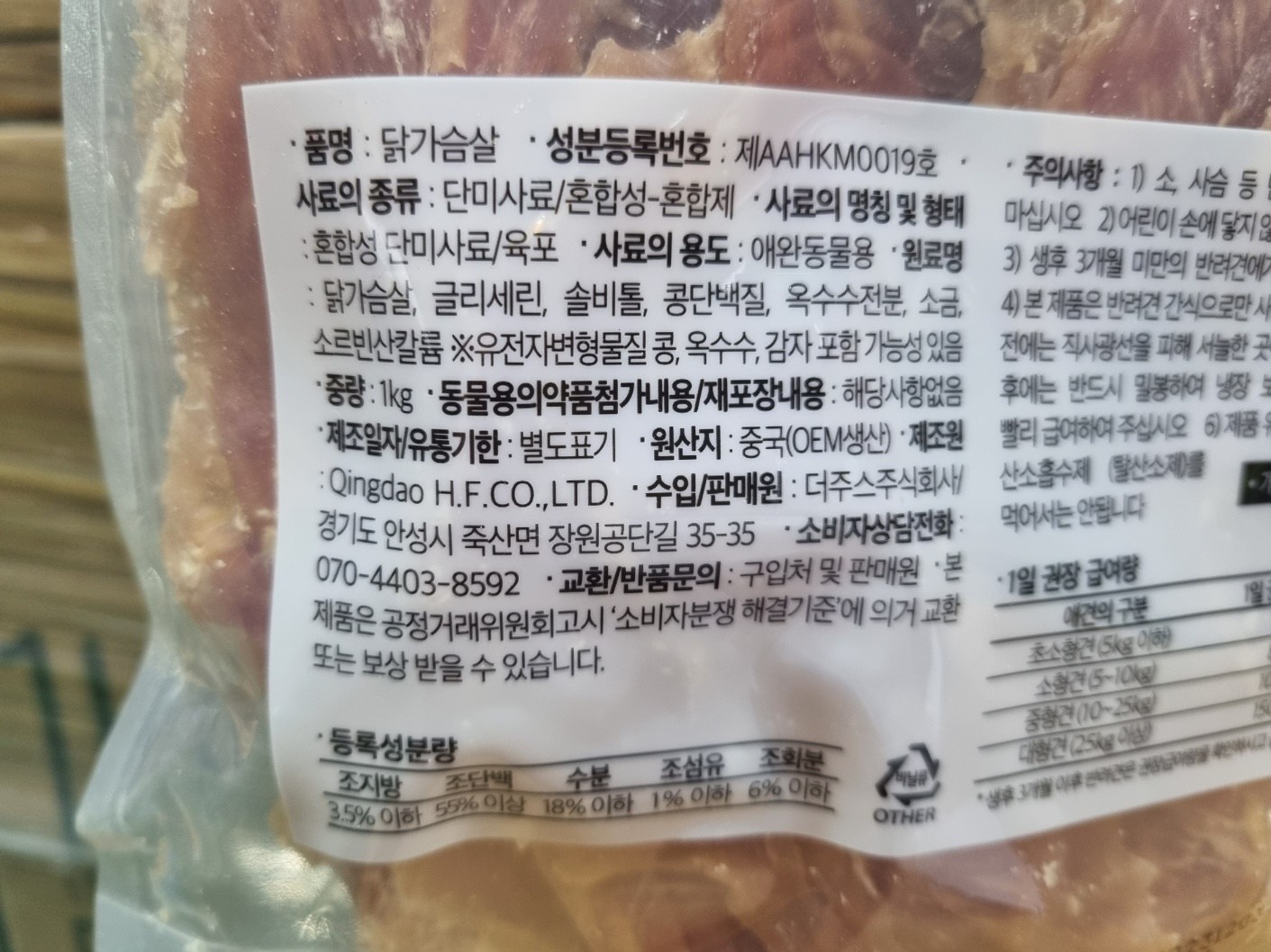 | 품명 및 모델명 | 1Kg 가득 담은 닭가슴살 | 인증/허가 사항 | 사료관리법에 따른 성분등록번호 : 컨텐츠 참조 |