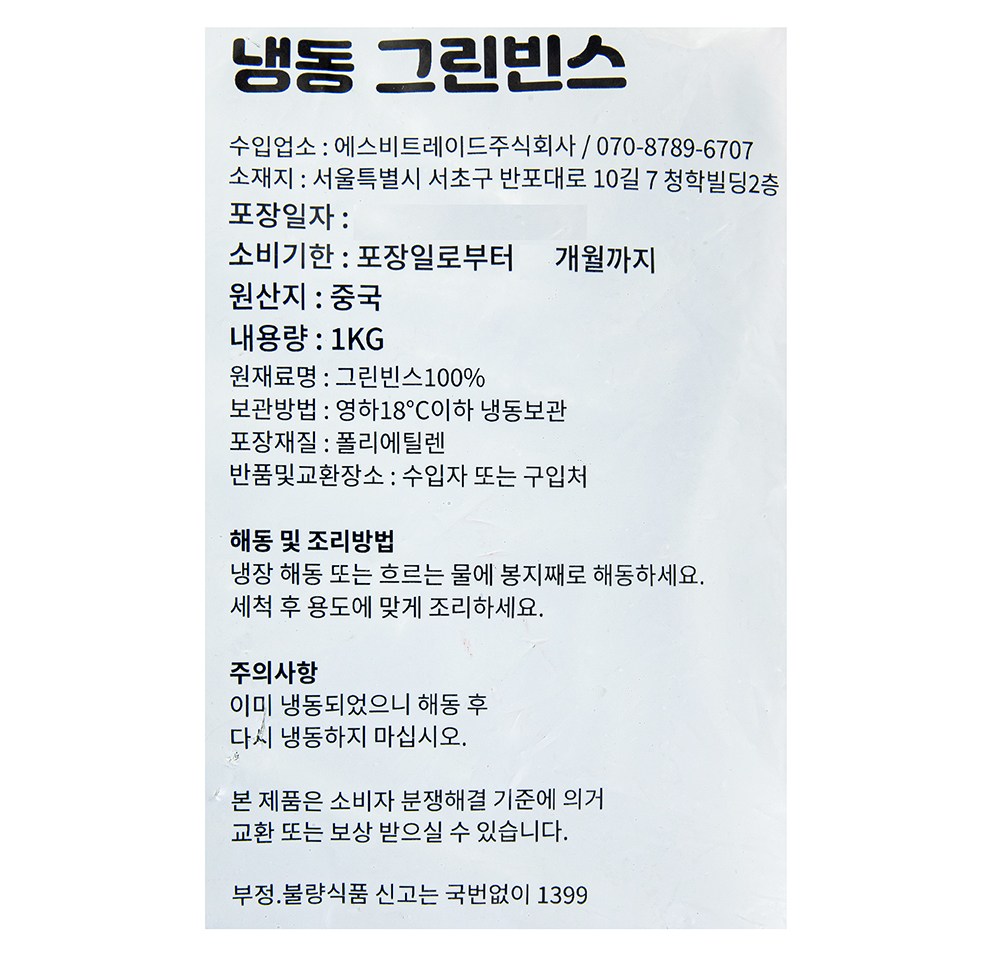 | 품목 또는 명칭 | 냉동 그린빈스 | 포장단위별 내용물의 용량(중량),수량,크기 | 컨텐츠 참조 |