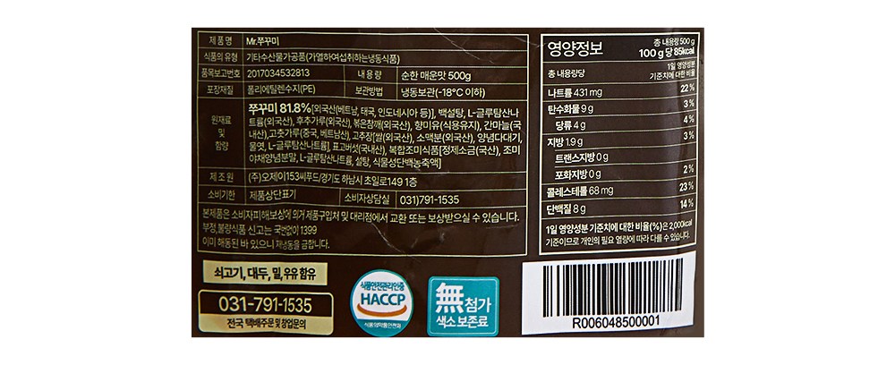 | 제품명 | 양념쭈꾸미(덜 매운맛) | 식품의 유형 | 수산물가공품 |