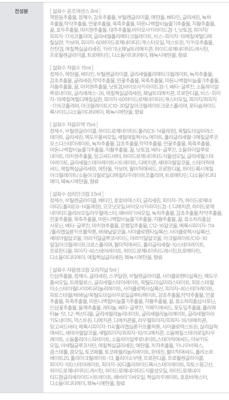 | 용량(중량) | 본품:50ml구성품:설화수 윤조에센스 8ML, 설화수 자음수 15ML, 설화수 자음유액 15ML, 설화수 섬리안크림 3.5ML, 설화수 자음생크림 5ml | 제품 주요 사양 | 본품:모든 피부용구성품:모든피부 |