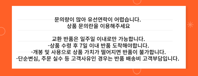 - 상품문의 및 후기게시판을 통해 취소나 환불, 반품 등은 처리되지 않습니다.