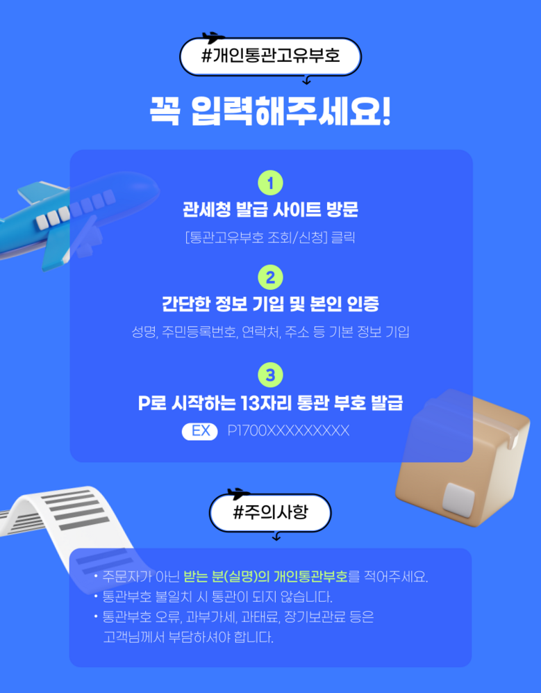 - 법규 개정에 따라 개인통관고유부호 검증 절차가 강화되었습니다. 결제 단계에서 받는 사람의 정보가 관세청 등록 정보 (성명, 휴대폰, 개인통관고유부호, 주소) 와 일치하는지 확인해주세요.