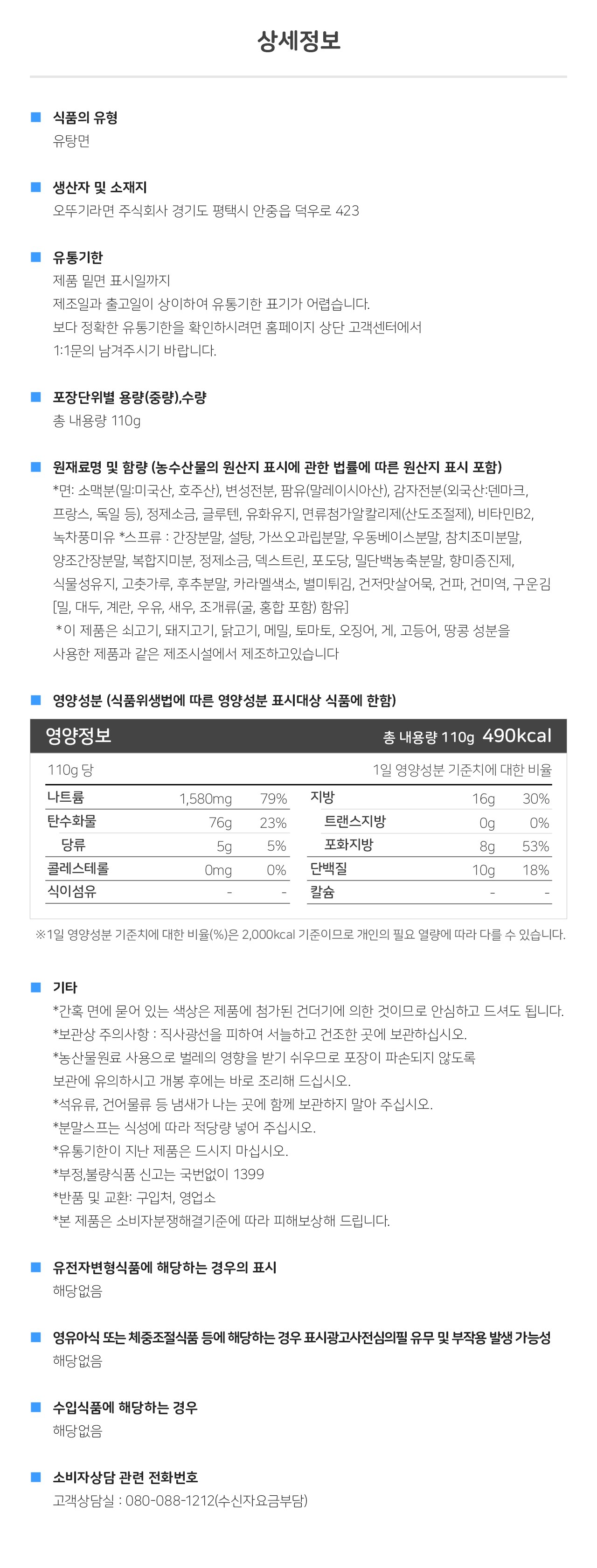 | 생산자 및 소재지 | 오뚜기라면 주식회사 / 경기도 평택시 안중읍 덕우로 423 | 제조연월일, 소비기한 또는 품질유지기한 | 소비기한(또는 유통기한) : 2026년 02월 02일 이거나 그 이후인 상품<br />제조년월일 : 2025년 07월 04일 이후인 제조상품 |