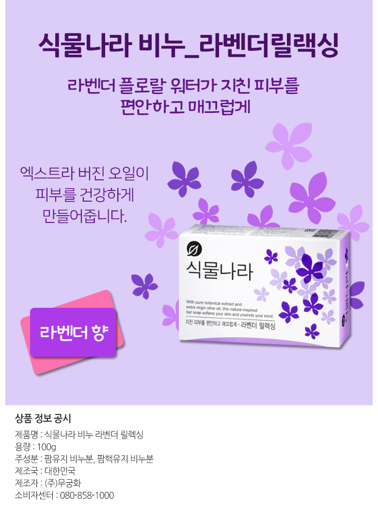 | 용량(중량) | 식물나라 비누 라벤더 릴랙싱 | 제품 주요 사양 | 모든피부용 |