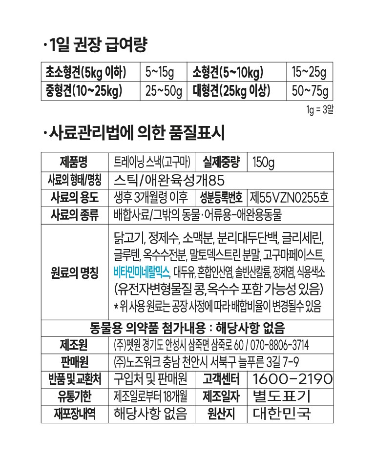 | 품명 및 모델명 | 노즈워크 트레이닝스낵 고구마 | 인증사항 | 해당없음 |