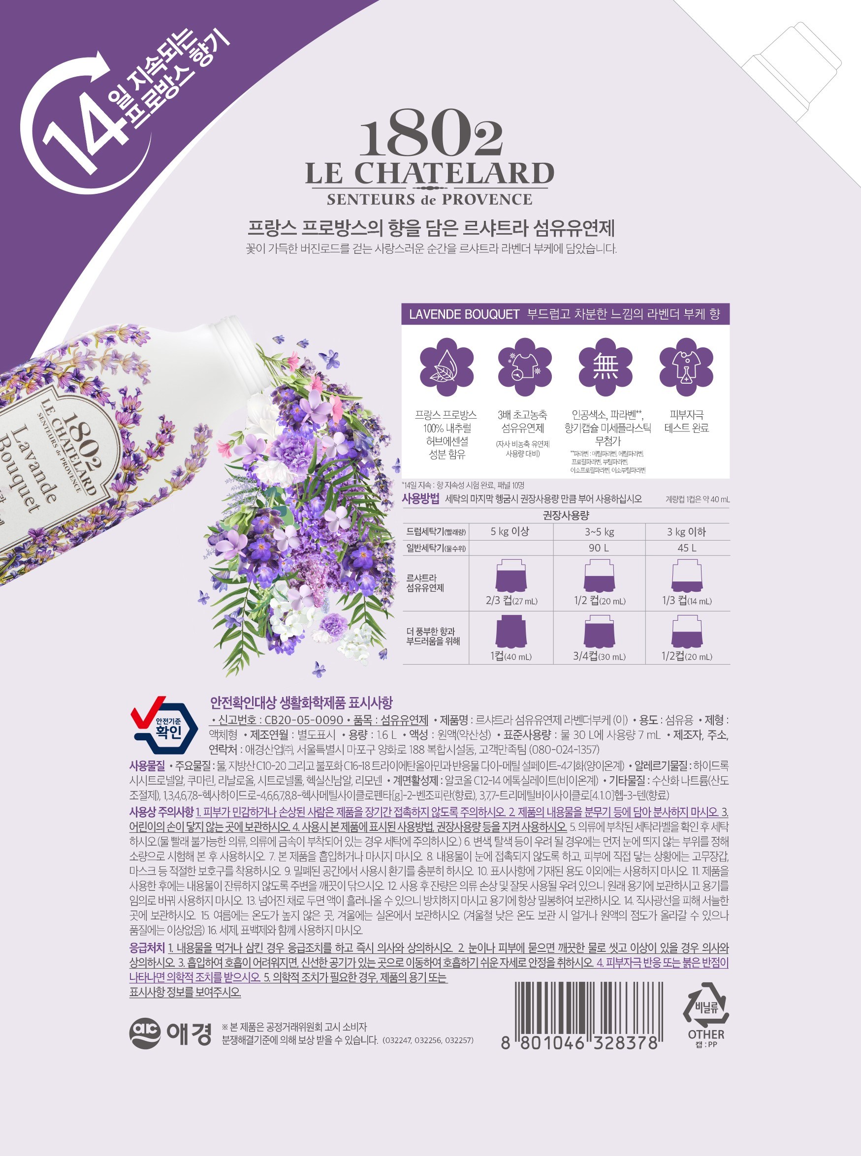 | 품목 및 제품명 | 섬유유연제 / 르샤트라 섬유유연제 라벤더부케 (이) | 용도(표백제의 경우 계열을 함께표시) 및 제형 | 섬유용 / 액체형 |