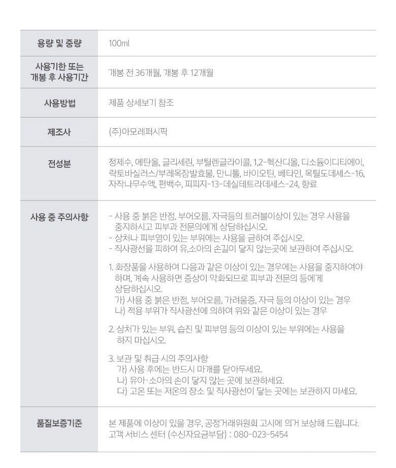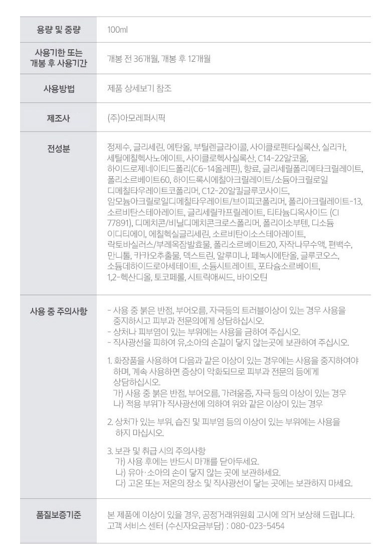 | 화장품제조업자, 화장품책임판매업자 및 맞춤형화장품판매업자 | (주)아모레퍼시픽 / (주)아모레퍼시픽 | 제조국 | 한국 |