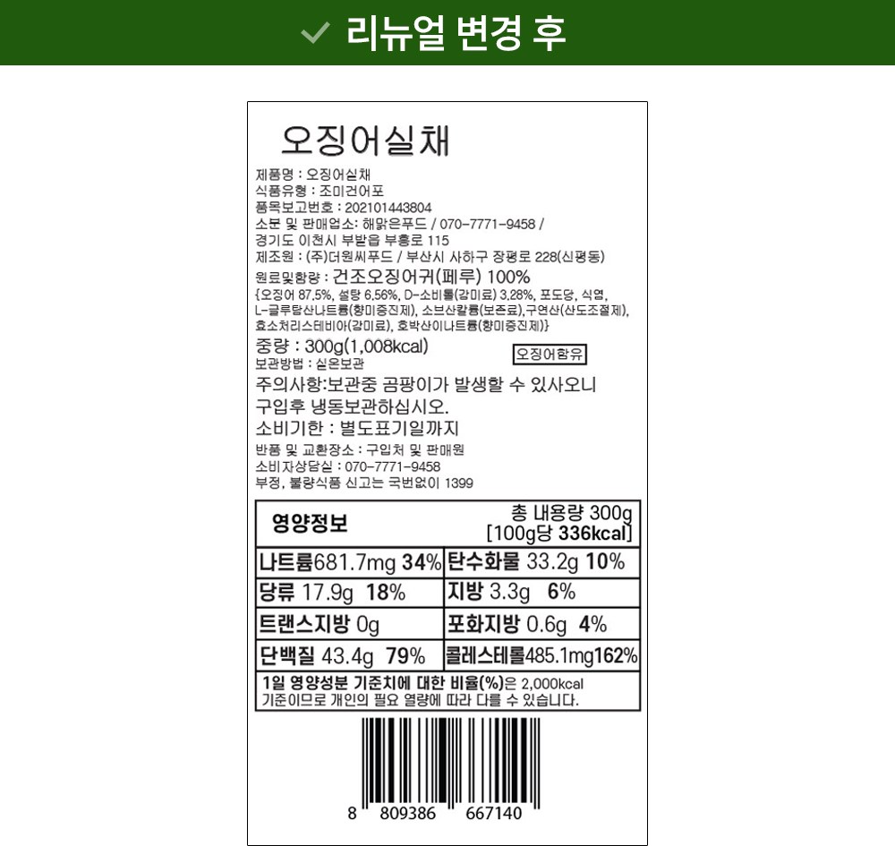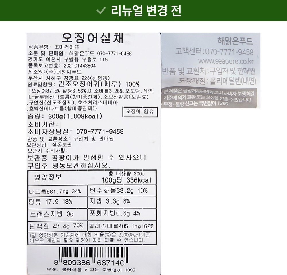 | 제품명 | 오징어실채 | 식품의 유형 | 컨텐츠 참조 |