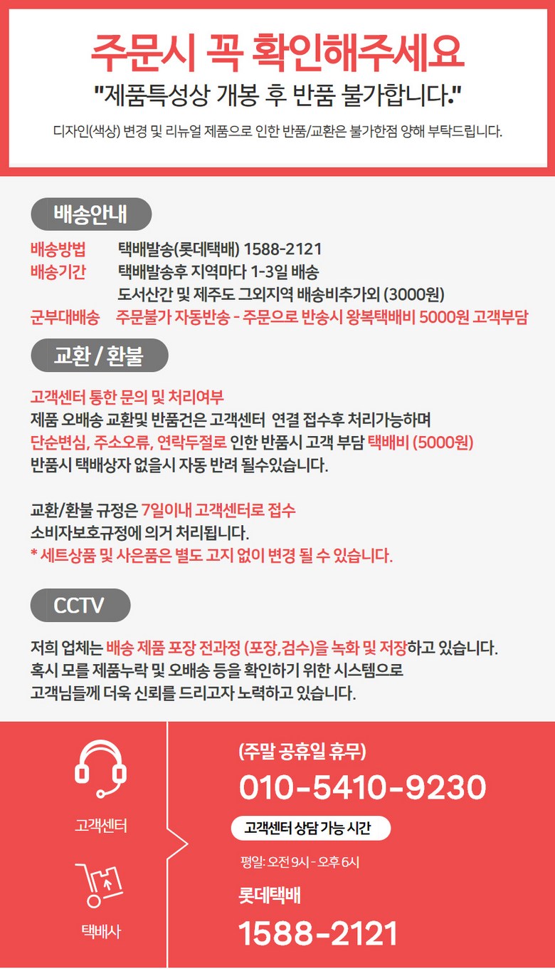 - ㆍ모니터 해상도의 차이로 인해 색상이나 이미지가 실제와 달라, 고객이 단순 변심으로 교환/반품을 무료로 요청하는 경우