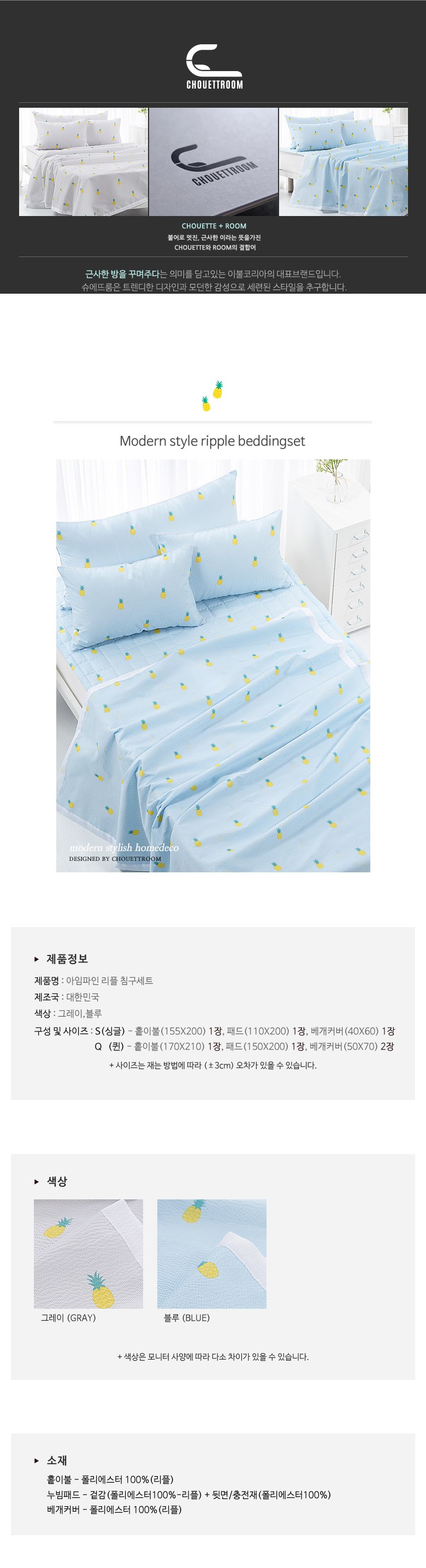 | 치수 | 컨텐츠 참조 | 제품구성 | 홑이불1개+누빔패드1개+베개커버1개 |