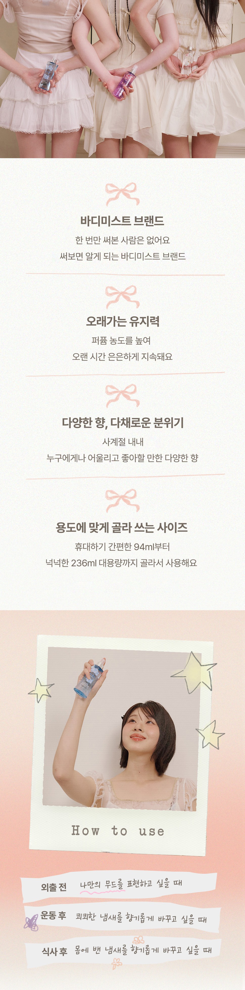 - 골고루 분사되는 미스트 타입으로 은은한 향을 오래 지속하는 바디 미스트