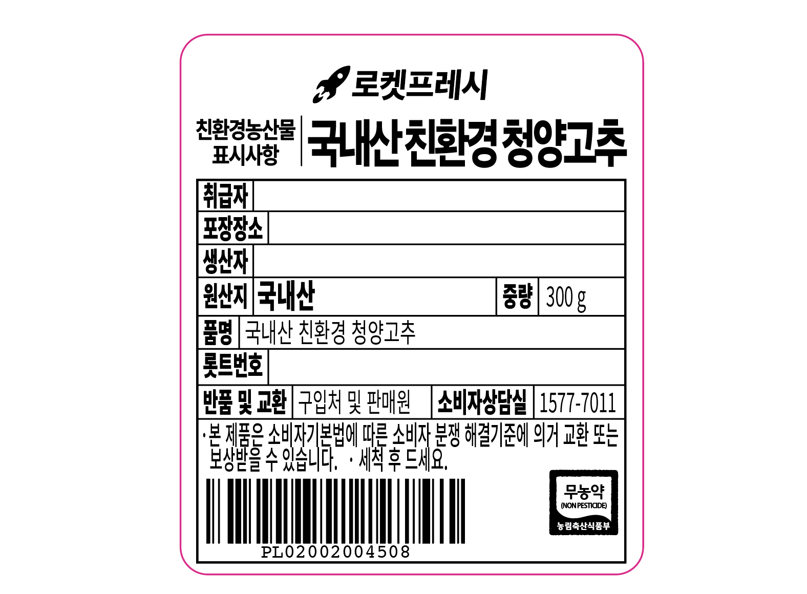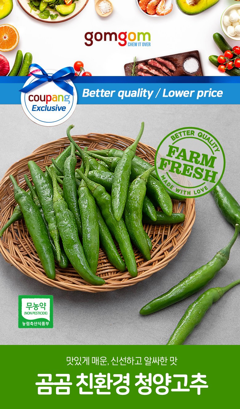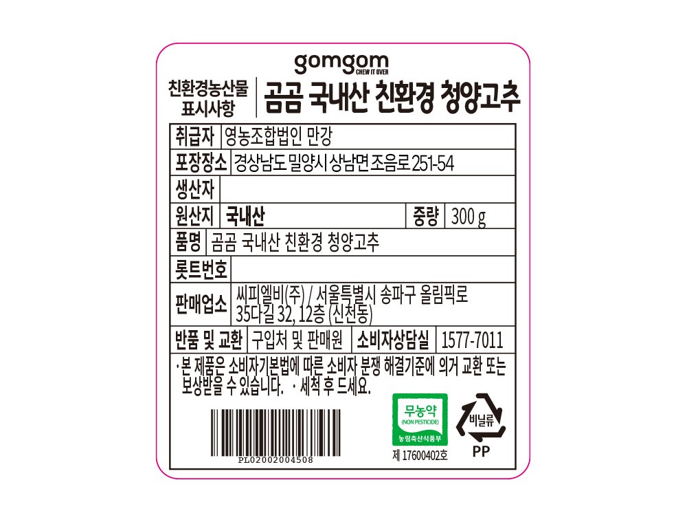 | 품목 또는 명칭 | 친환경 청양고추 | 포장단위별 내용물의 용량(중량),수량,크기 | 300gx2개 |