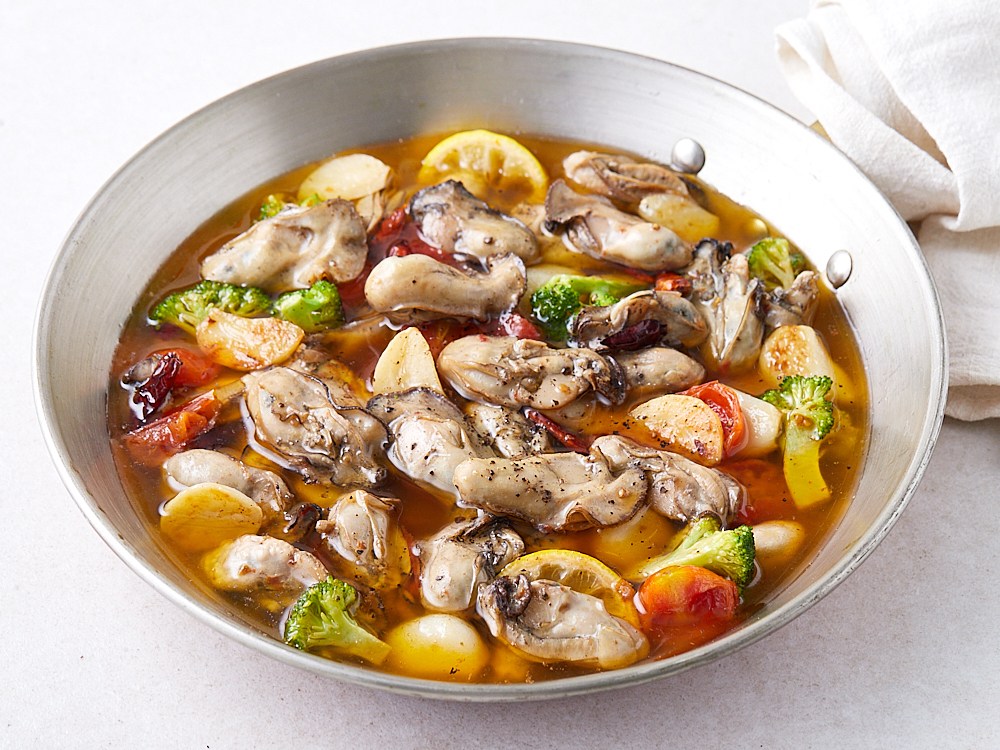 재료: 굴 300g, 통마늘 한 줌, 브로콜리 1/4송이, 방울토마토 5개, 레몬 1/4개