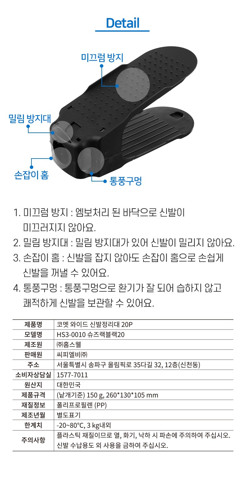 | 품명 및 모델명 | 코멧 와이드 신발정리대 블랙 20P | 인증/허가 사항 | 해당없음 |