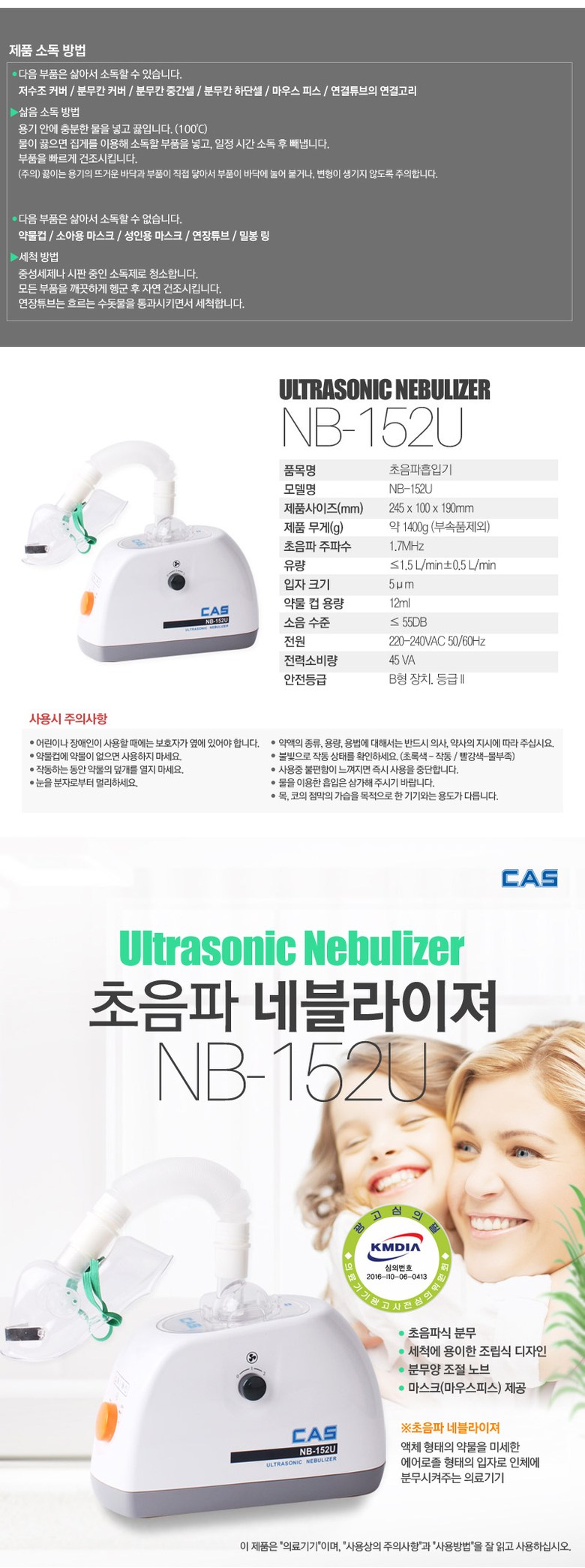 | 품명 및 모델명 | 초음파 네블라이져 / NB-152U | 허가∙인증∙신고번호 (의료기기법에 따른 허가∙인증∙신고 대상 의료기기에 한함) | 수인 16-4027호 / 2016-I10-06-0413 |