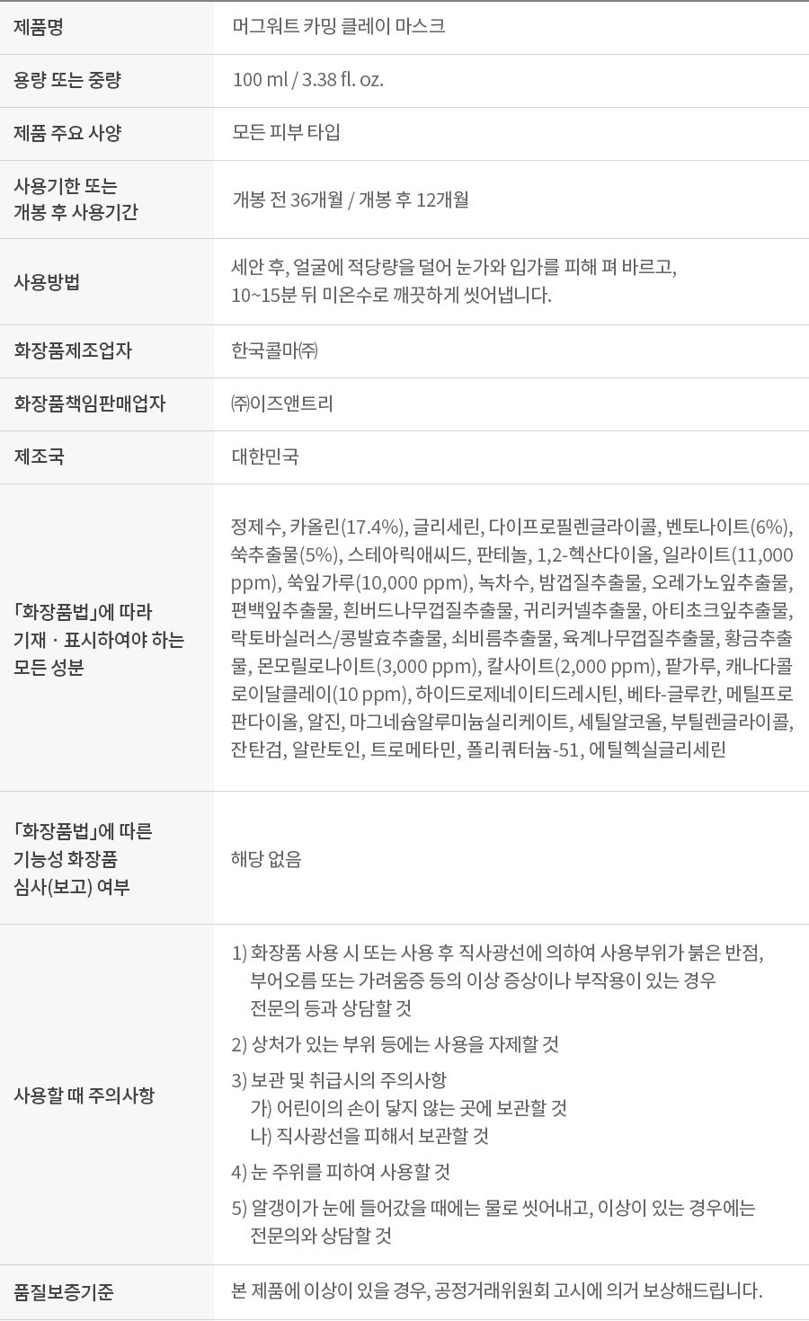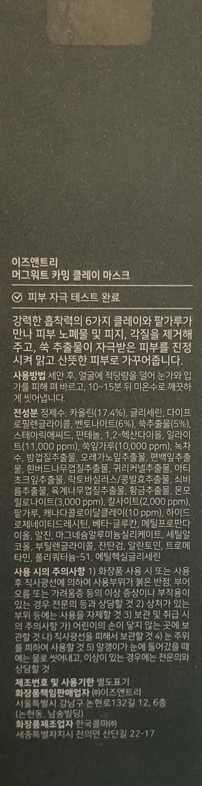 | 화장품제조업자, 화장품책임판매업자 및 맞춤형화장품판매업자 | 한국콜마(주) / (주)이즈앤트리 | 제조국 | 대한민국 |