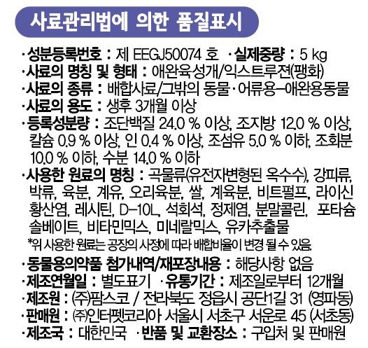 | 품명 및 모델명 | 도기밸런스 전연령 소형견 건식사료 오리 | 인증사항 | 사료관리법에 따른 성분등록번호 : 컨텐츠 참조 |