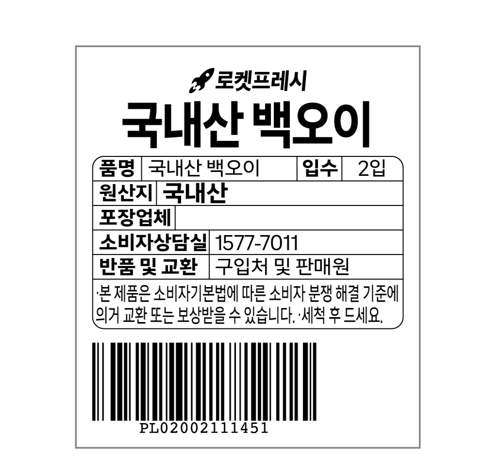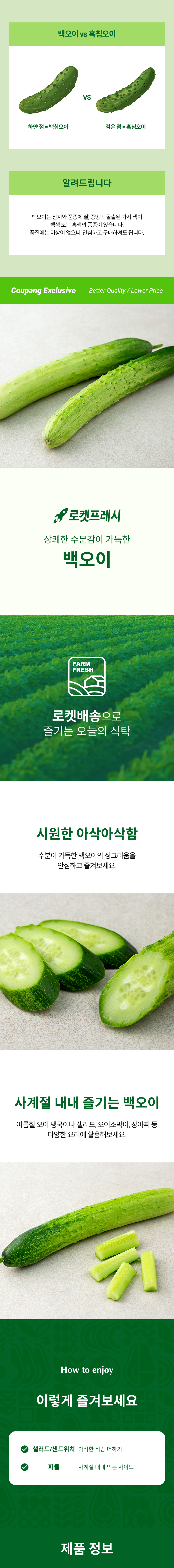 | 품목 또는 명칭 | 국내산 백오이 | 포장단위별 내용물의 용량(중량),수량,크기 | 2개입(200g) |