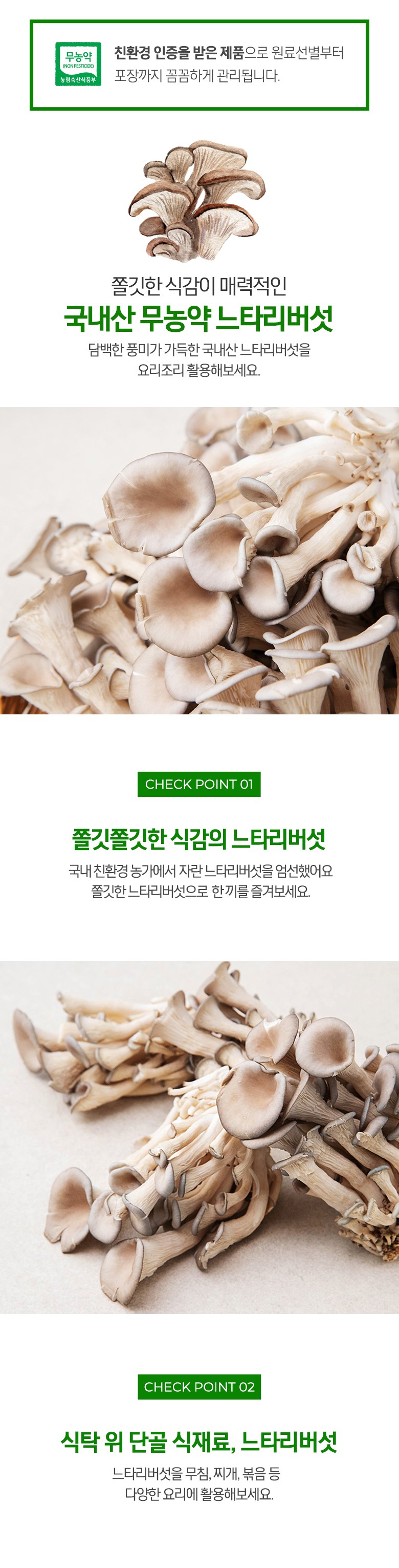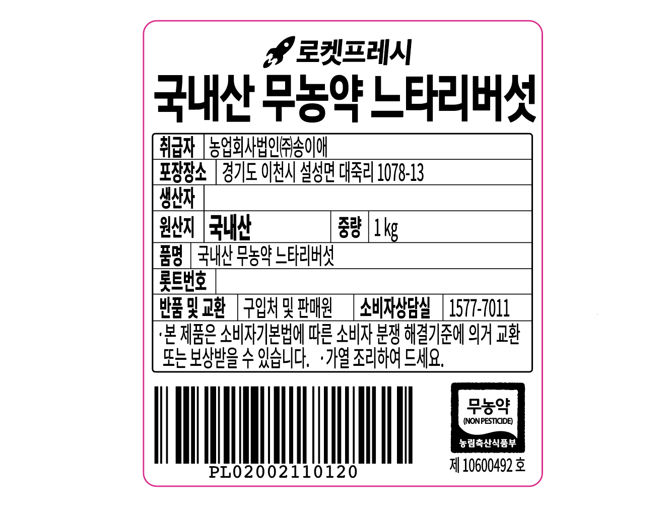 | 품목 또는 명칭 | 국내산 무농약 느타리버섯 | 포장단위별 내용물의 용량(중량),수량,크기 | 1kgx3개 |