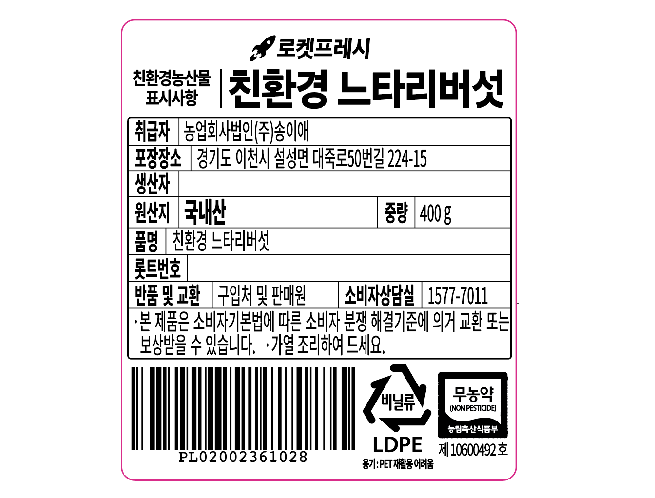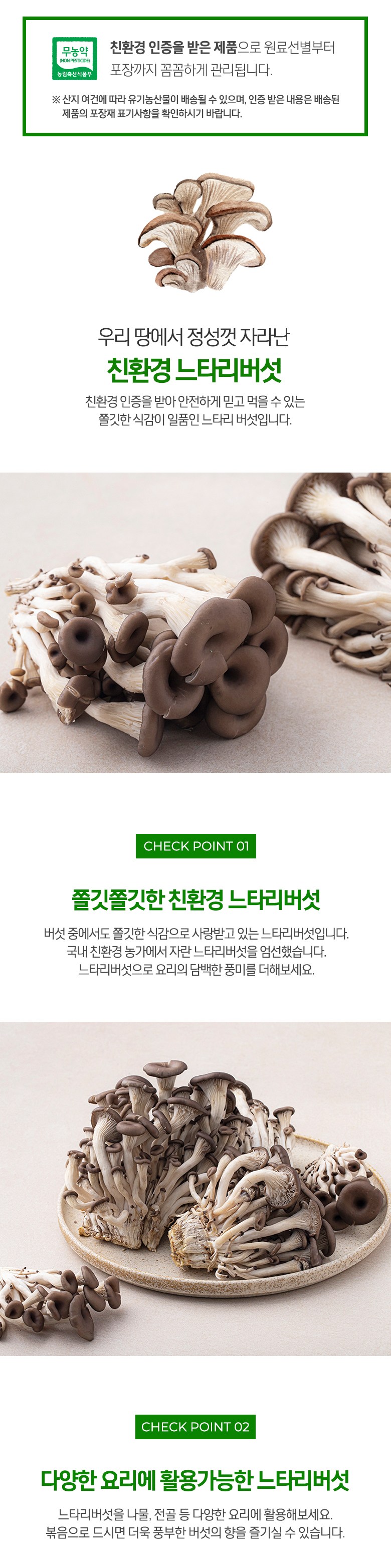 | 품목 또는 명칭 | 친환경 느타리버섯 | 포장단위별 내용물의 용량(중량),수량,크기 | 400g x 4팩 |