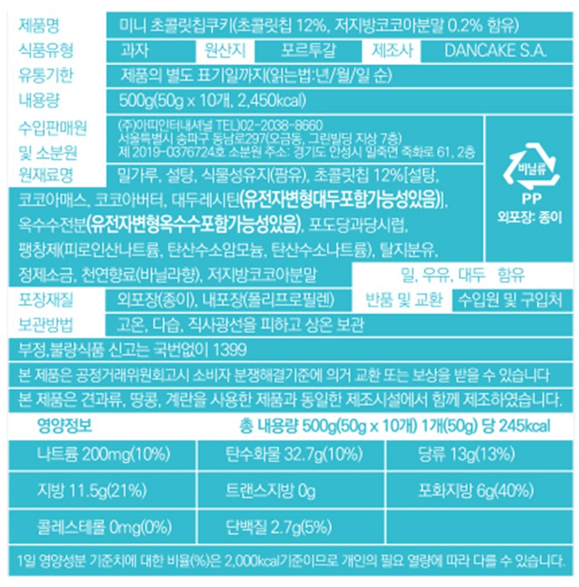 | 제품명 | 미니 초콜릿칩쿠키 | 식품의 유형 | 컨텐츠 참조 |