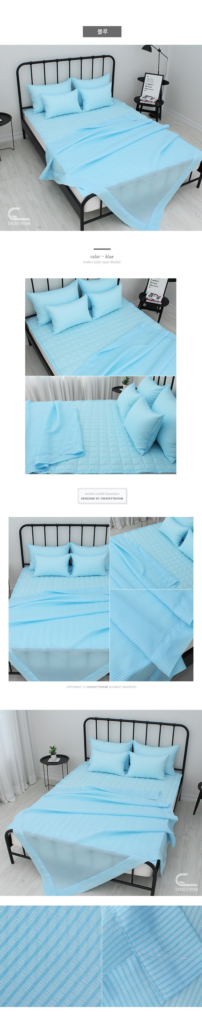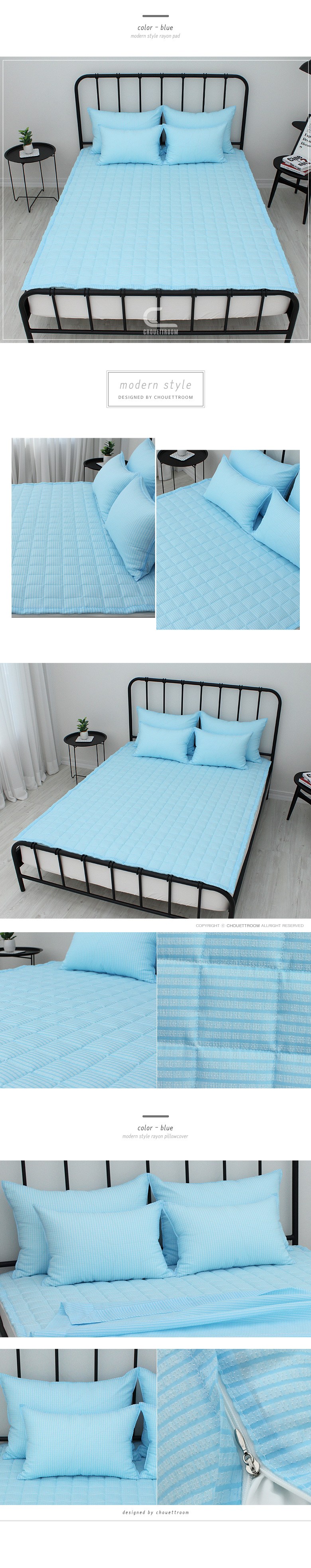 | 제품 소재 | 홑이불 : 인견40%+폴리에스터60%, 누빔패드 : 겉감(인견 40% + 폴리에스터 60%), 뒷면/충전재(폴리에스터 100%), 베개커버 : 인견40%+폴리에스터60% | 색상 | 블루 |