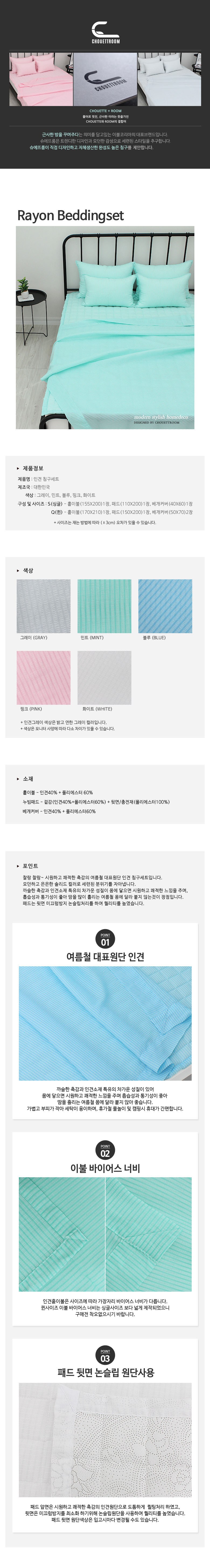 | 치수 | 홑이불 : 155 x 200 cm, 누빔패드 : 110 x 200 cm, 베개커버 : 40 x 60 cm | 제품구성 | 홑이불 1장, 누빔패드 1장, 베개커버 1장 |